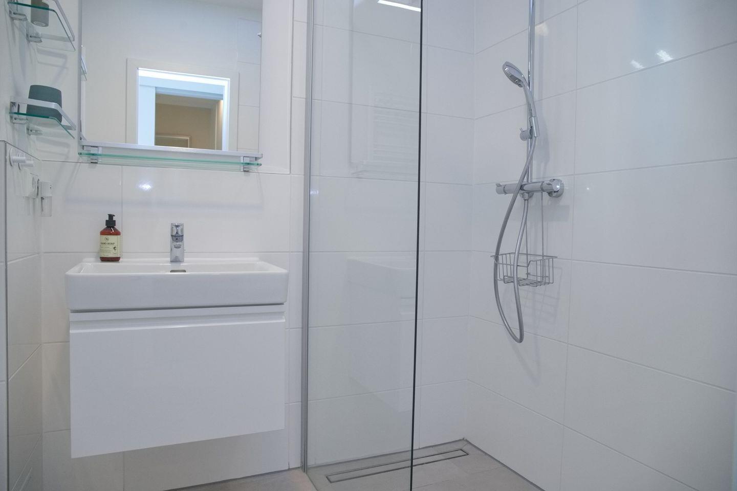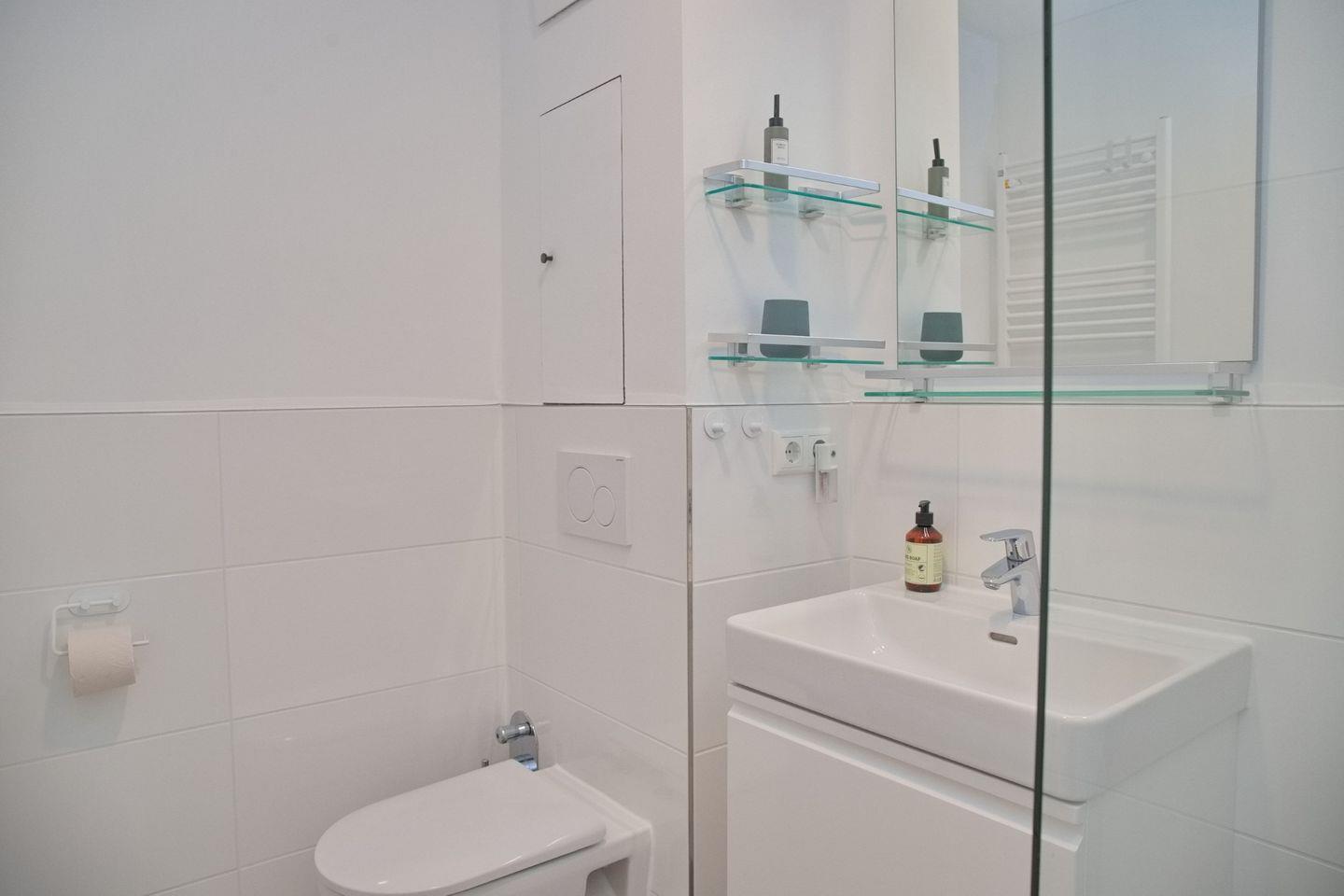 Das Badezimmer wurde komplett saniert und erstrahlt in modernem Design. Es bietet eine bodengleiche Dusche mit eleganter Glastrennwand, einen Waschtisch mit beleuchtetem Spiegel und ein WC.