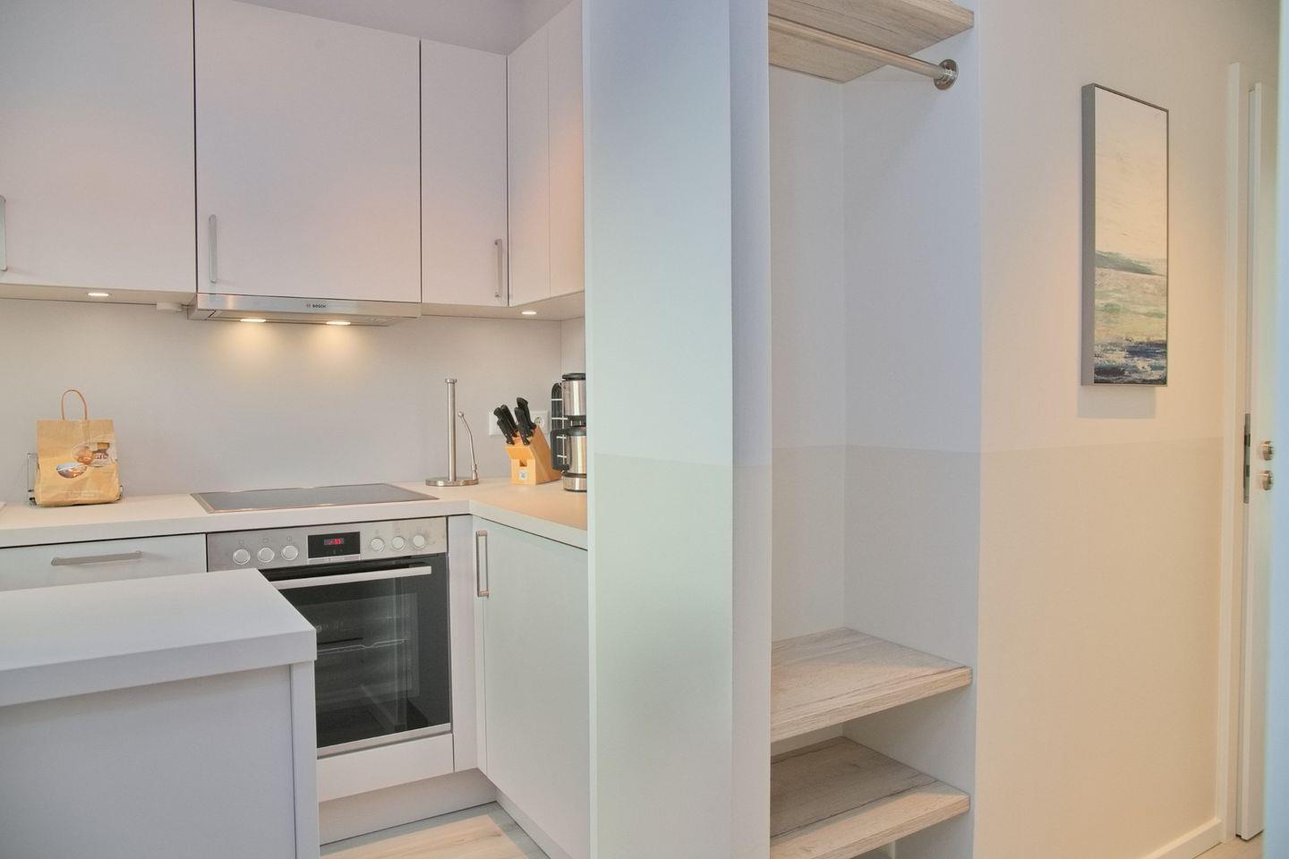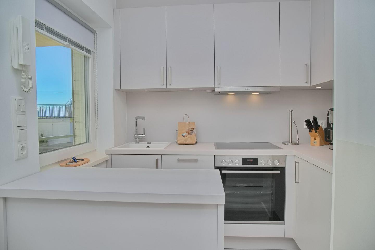Die offene Küche ist ebenfalls neu und hochwertig ausgestattet. Sie verfügt über ein Cerankochfeld, einen Backofen, einen Kühlschrank mit Gefrierfach und einen Geschirrspüler. Toaster, Kaffeemaschine und Wasserkocher runden die Ausstattung ab und machen die Zubereitung von Mahlzeiten besonders bequem.