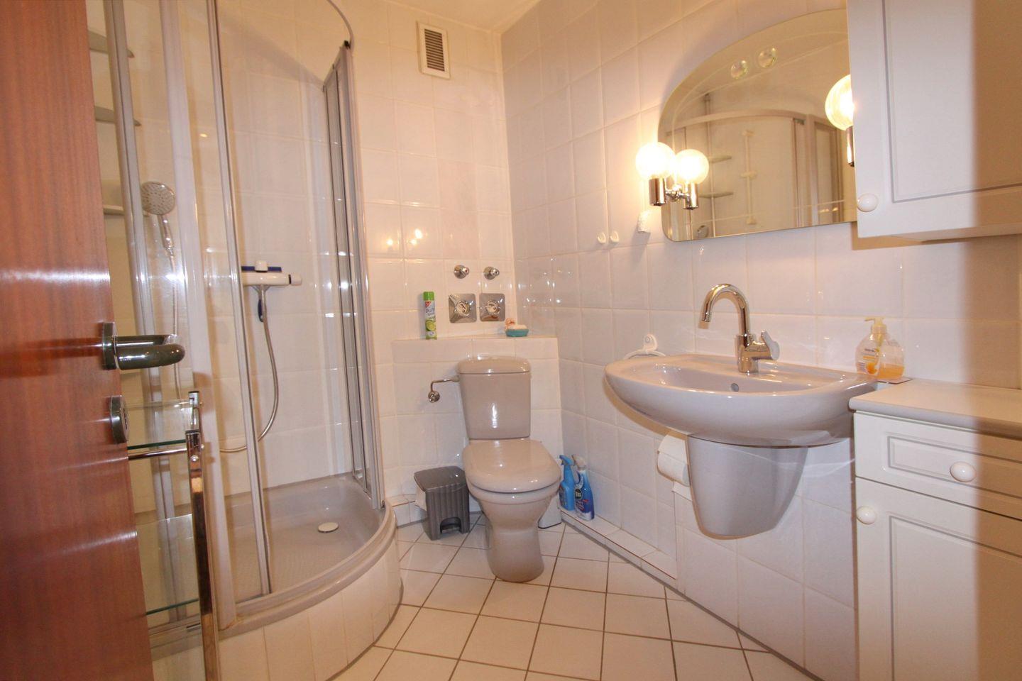 Sie kommen in die Wohnung und befinden sich im Flur mit ausreichend Stauraum, durch Einbauschränke. Zu Ihrer Rechten geht es zum grau/weiß gehaltenen Duschbad mit Rund Glass Dusche, WC, Waschbecken und Spiegel.