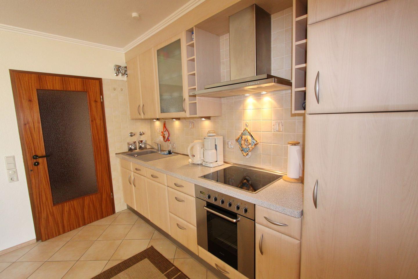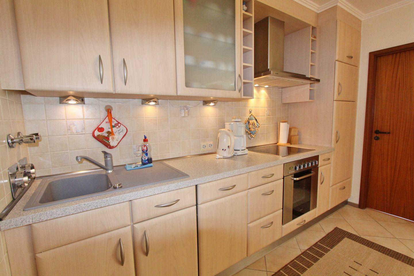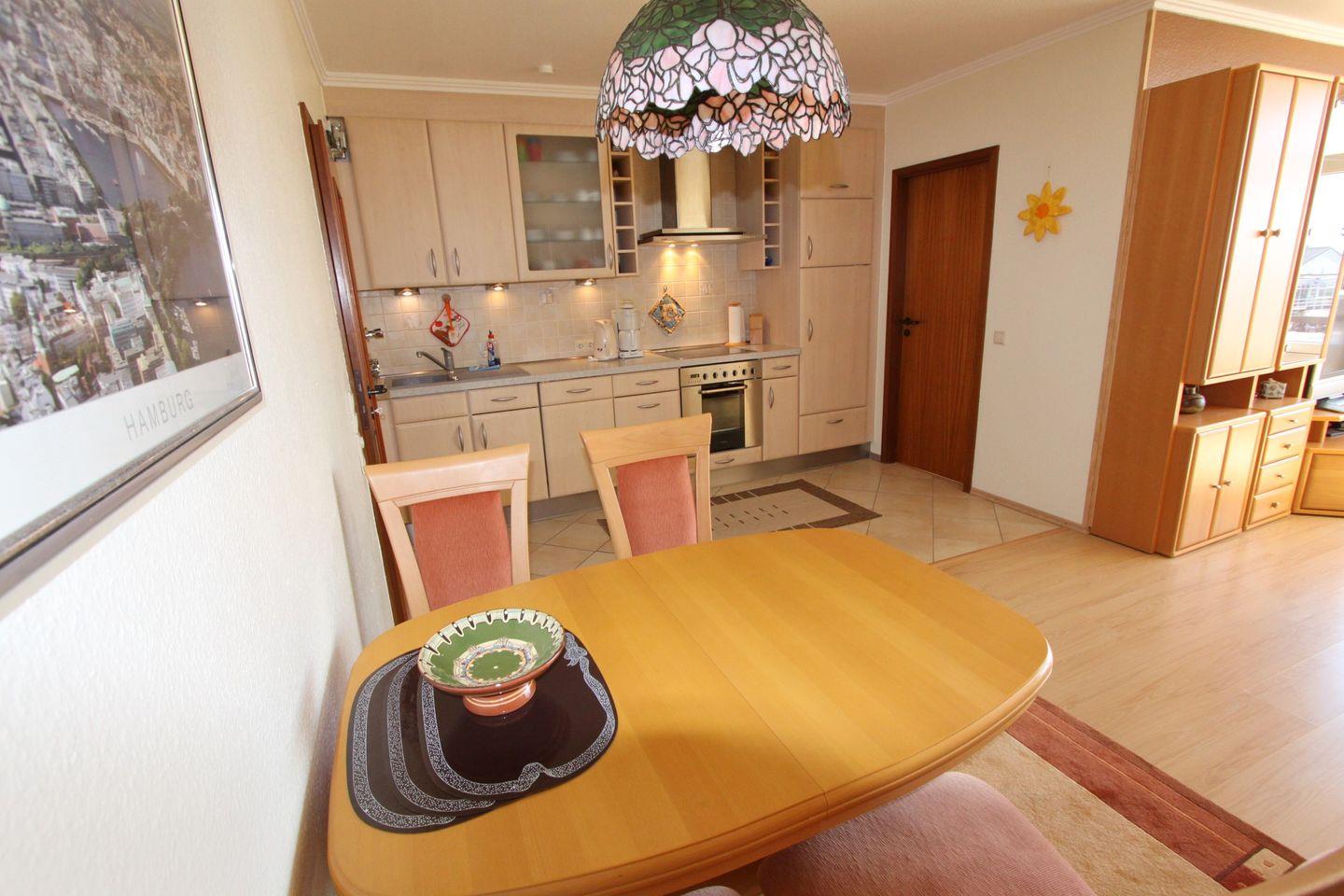 Zu Ihrer linken ist die voll ausgestattete Küchenzeile mit Ceranfeld, Kühlschrank mit Gefrierfach, Spülmaschine, Backofen, Wasserkocher, Kaffeemaschine und Toaster. Auf der Rechten finden Sie den Essbereich mit 4 Sitzmöglichkeiten.
