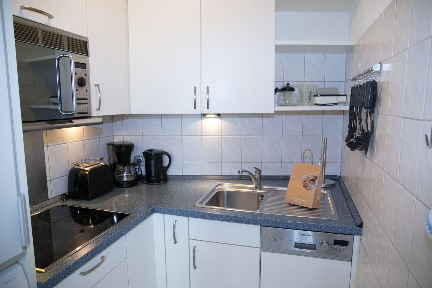 Mikrowellen-Kombi, Kaffeemaschine, Wasserkocher und Toaster stehen zur