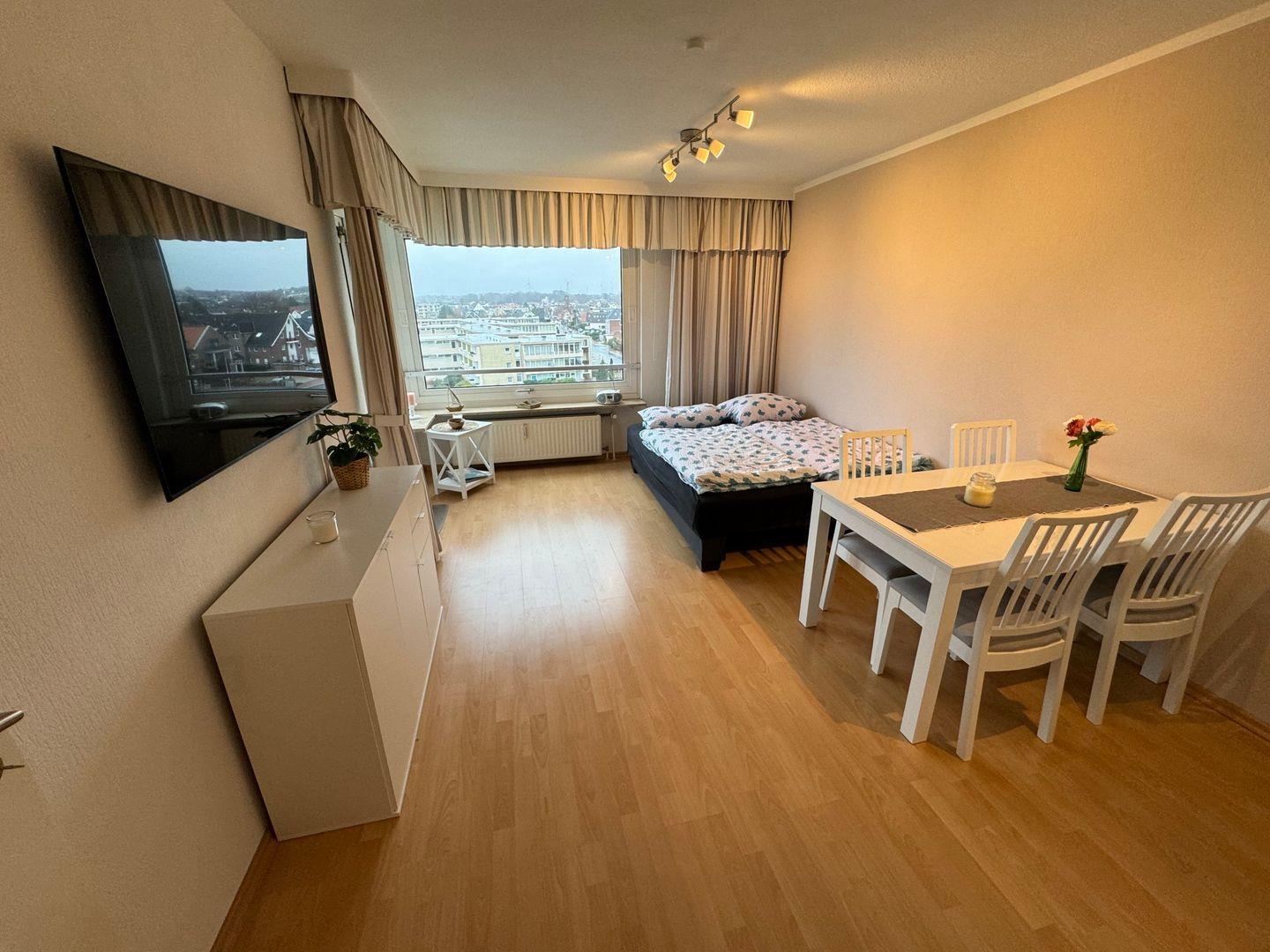 Sehr schöne 2 Zimmer Ferienwohnung mit möbliertem Süd-Balkon und Seeblick in Strandnähe. Direkt hinter dem Deich in der Nähe vom Hundestrand.