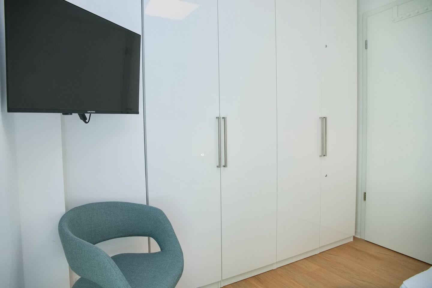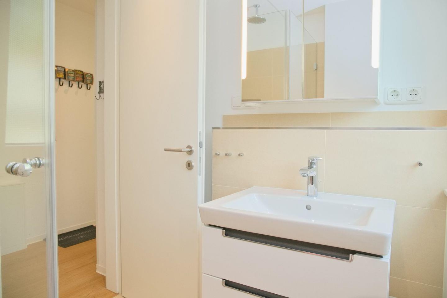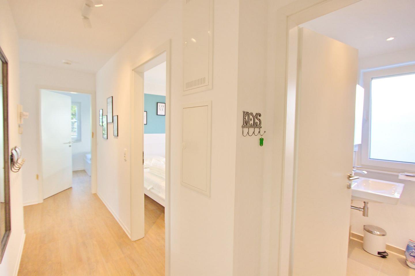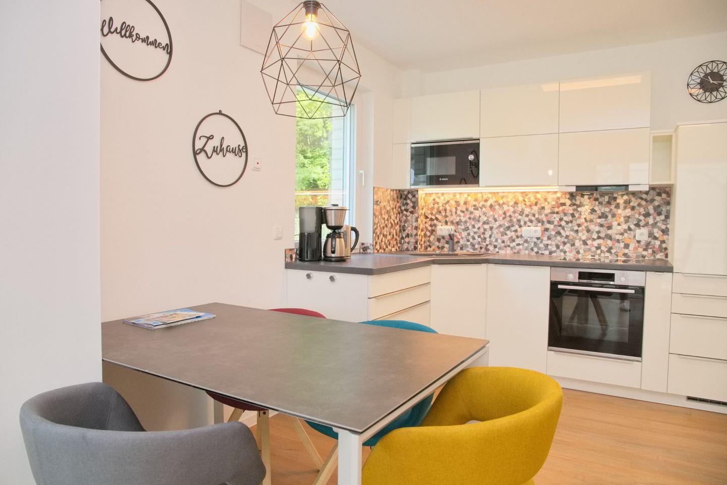 Ihre moderne Design-Küche im edlen Weiß verwöhnt Sie mit Cerankochfeld, Mikrowelle, Backofen, Geschirrspüler sowie einer Kaffeemaschine, Wasserkocher und Toaster. Ihr Bad bietet Ihnen eine ebenerdige Dusche, WC und Waschtisch. Ein beheizter Handtuchhalter versteht sich von selbst.