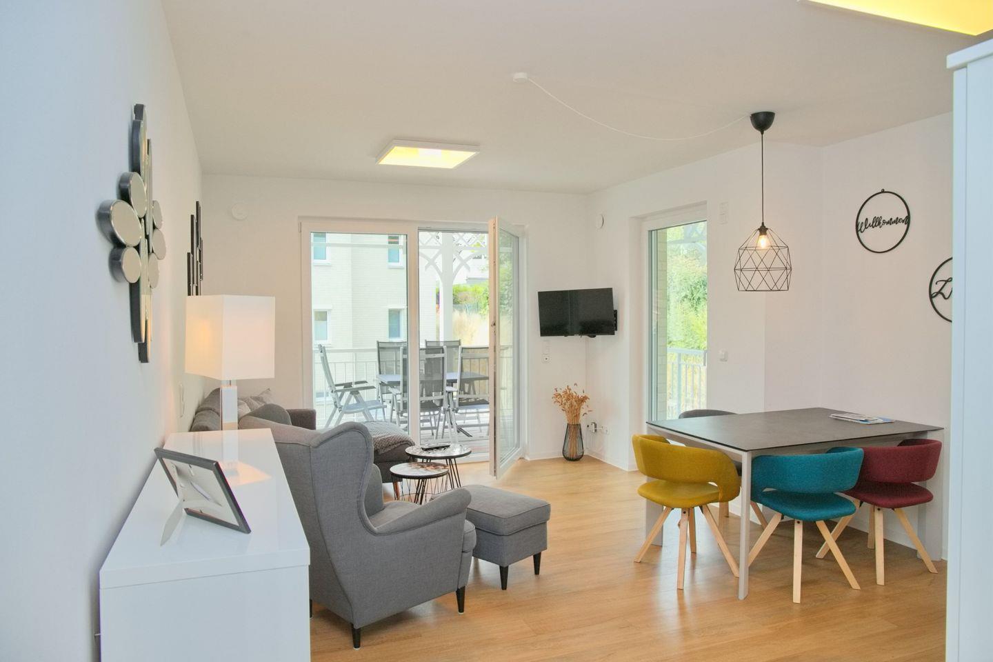 Zunächst empfängt Sie ein kleiner Dielenbereich mit Garderobe. Ihr Wohnbereich wurde sehr geschmackvoll und mit Liebe zum Detail für Sie gestaltet. Die gemütliche Eckcouch wird im Handumdrehen zu einem weiteren Schlafplatz. Zahlreiche Accessoires sowie wertiges Mobiliar im Modern Style schafft eine ganz besonders schöne Wohnatmosphäre. Flat-TV, WLAN, verstehen sich von selbst. Schöner Essbereich, welcher sich im Handumdrehen ausziehen lässt.