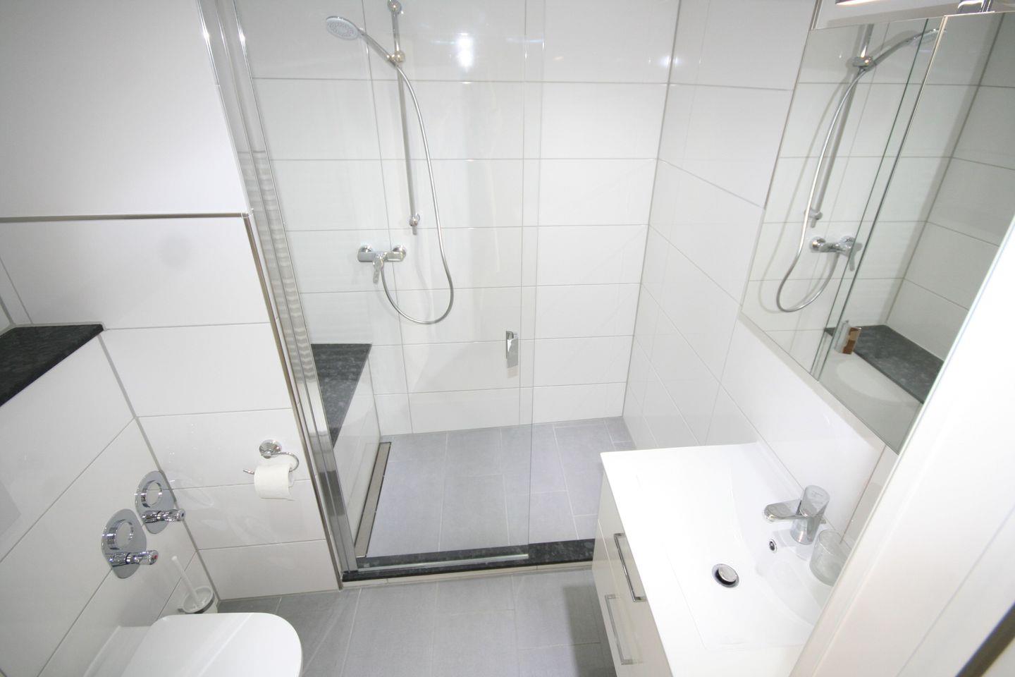 Das Badezimmer verfügt über eine große Dusche mit einer praktischen Bank, ein WC, einen Waschtisch, einen beleuchteten Spiegel und einen Handtuchheizkörper für Ihren Komfort.