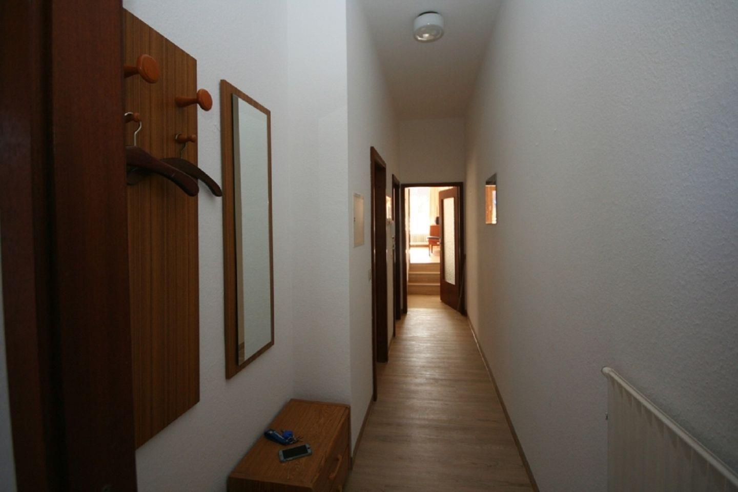 Schöne 3-Zimmer-Wohnung, ca. 63 qm, in der 1. Etage einer gepflegten Appartementanlage, mit Süd-Westbalkon. Vom Flur gelangen Sie über 3 Stufen in das helle Wohnzimmer, dort stehen eine Schlafcouch für die 5. Person und 2 Sessel, ein Flatscreen, ein Radio und eine Essecke mit 5 Stühlen. Von hier gelangen Sie auf den möblierten Balkon und auf die Terrasse, welche auch von einem der Schlafzimmer begehbar ist. Die Küche ist mit einem 4-Plattenherd mit Backofen, Kühlschrank mit Gefrierfach, einer Mikrowelle, Kaffeemaschine und Toaster ausgestattet. In beiden Schlafzimmern befinden sich ein Doppelbett mit 2 Nachttischen und ein Kleiderschrank. Die Wohnung ist mit Vinylboden in Holzoptik ausgelegt. Die Wohnung verfügt über ein modernes neues Duschbad/WC.