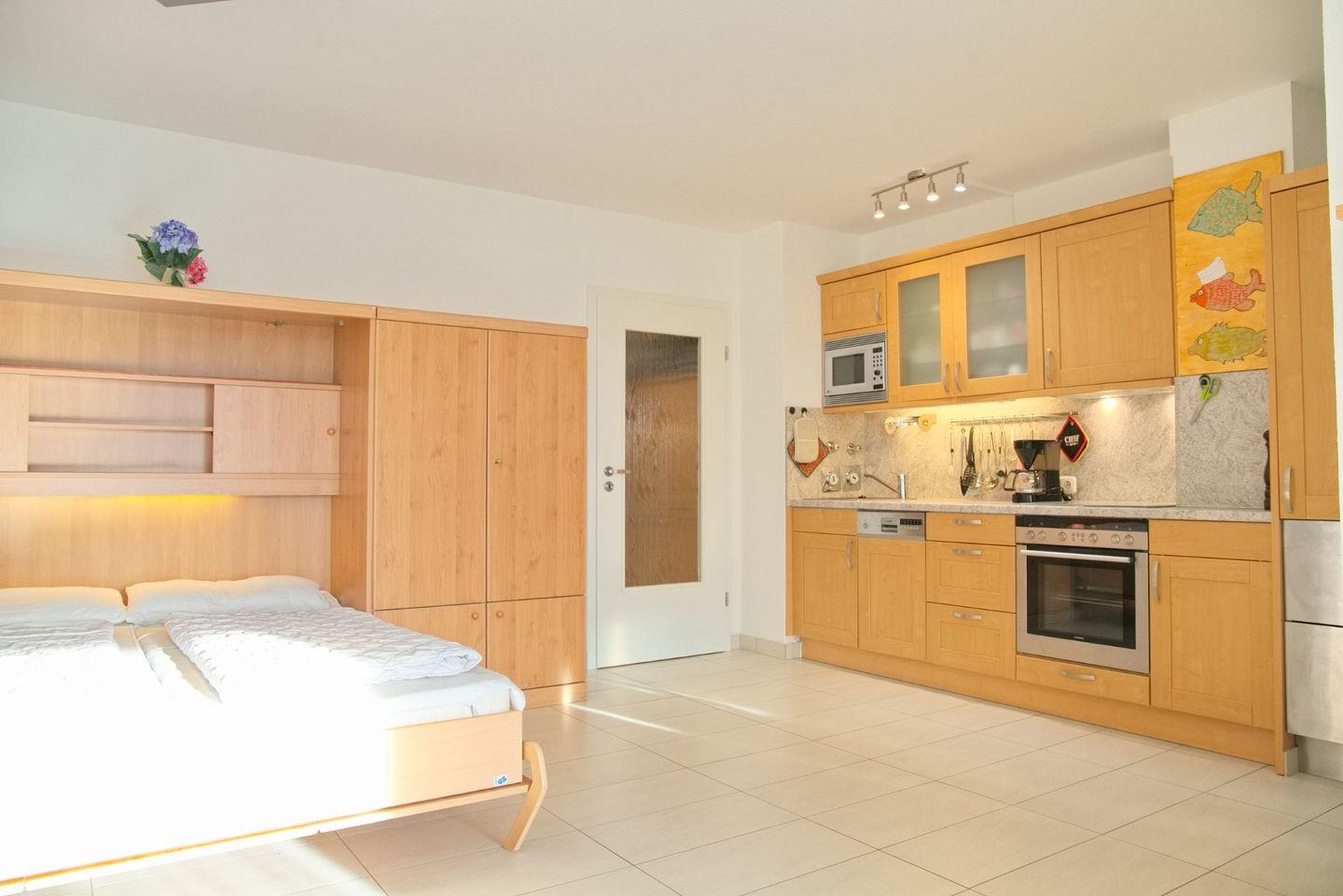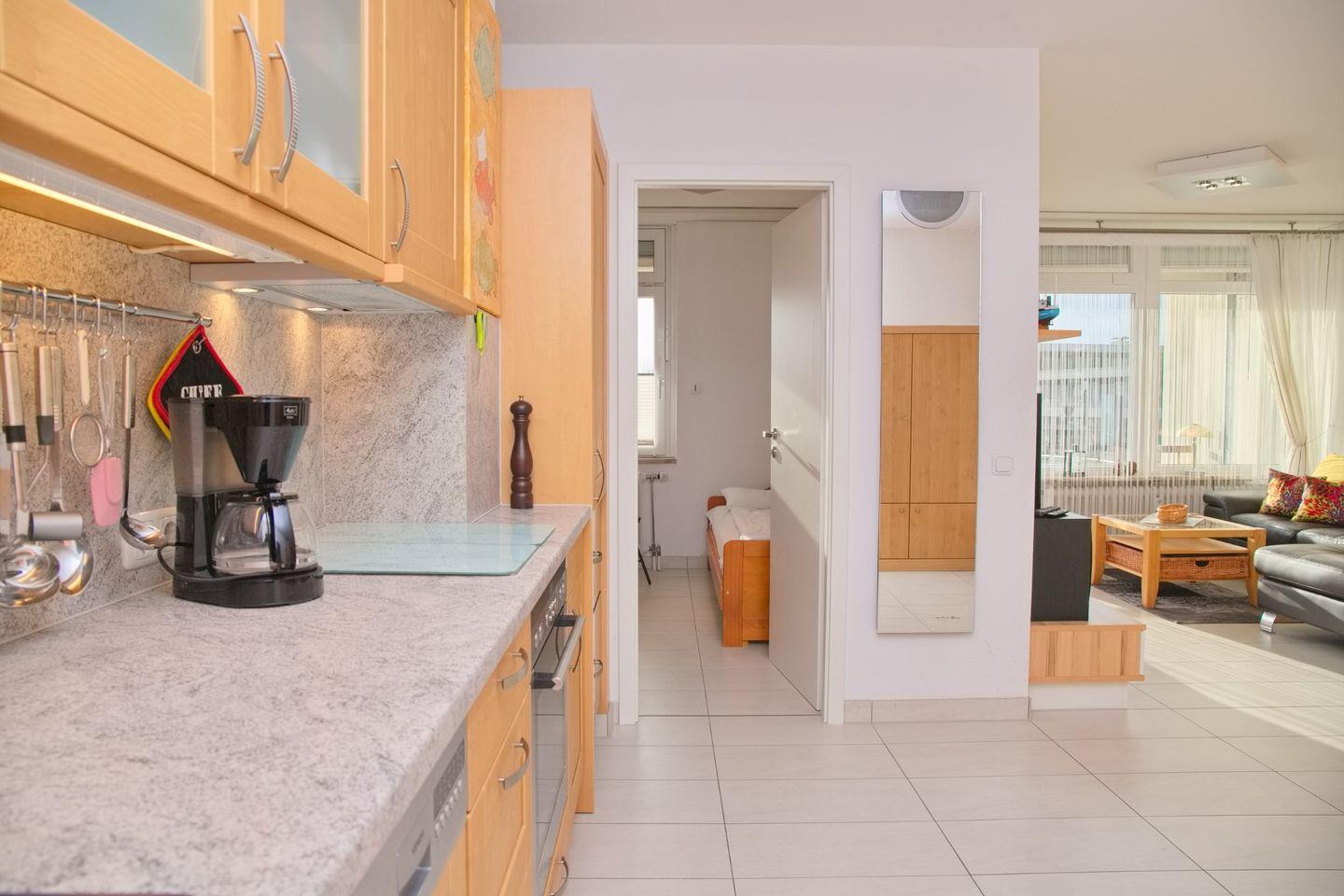 Die angrenzende offene Küche ist mit allem ausgestattet, was man für die Zubereitung schmackhafter Mahlzeiten benötigt: ein Herd, eine Mikrowelle, ein Kühlschrank mit Gefrierfach, eine Spülmaschine und eine Kaffeemaschine sind nur einige der Annehmlichkeiten, die Sie hier erwarten.