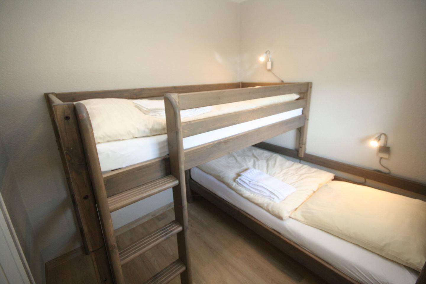 Das Kinderzimmer hat ein praktisches Ecketagenbett. Helles Tageslicht empfängt Sie im Bad das mit einer Dusche, einem WC, einen Waschtisch und einen Spiegelschrank ausgestattet ist.
