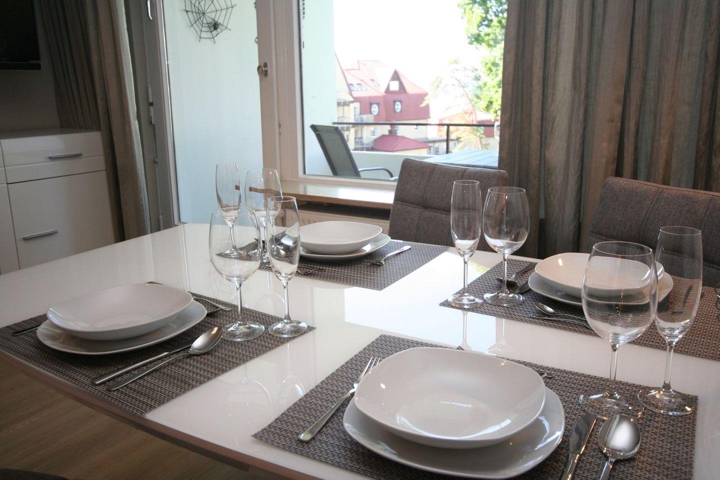 3 Zimmer-Ferienwohnung im 4. Obergeschoss mit möblierten Westbalkon und Teilseeblick. Nur wenige meter vom Strand und der Promenade in Grömitz entfernt.