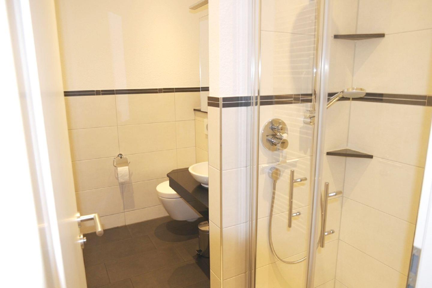 Das Dusch-Bad wurde komplett neu saniert und lädt mit seiner großzügigen Dusche mit Regenbrause und der geschmackvollen Ausstattung zum Wohlfühlen ein.