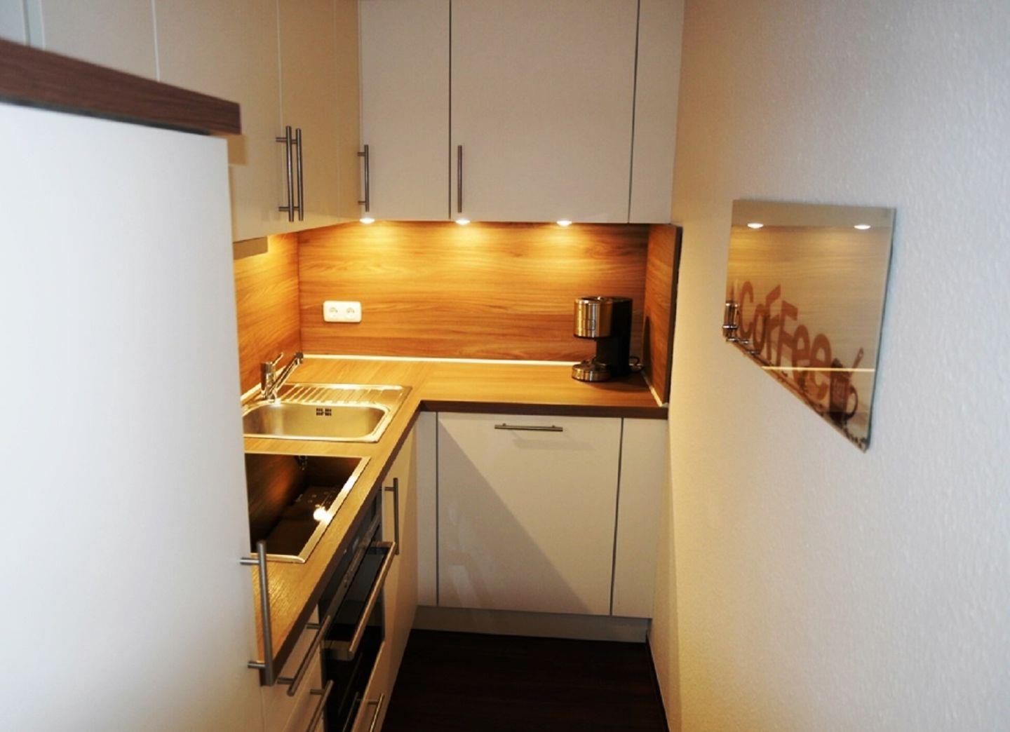 Die separate Küche hat ein Ceranfeld und ist mit Backofen inklusive einer Mikrowellenfunktion, Geschirrspüler, Kühlschrank mit Gefrierschrank, einer Kaffeemaschine, einem Wasserkocher und einem Toaster ausgestattet.