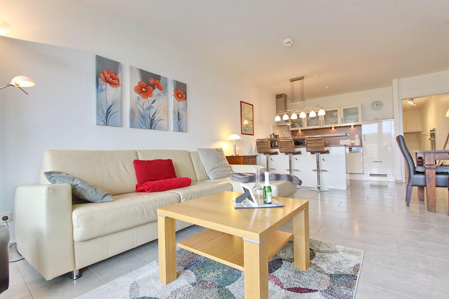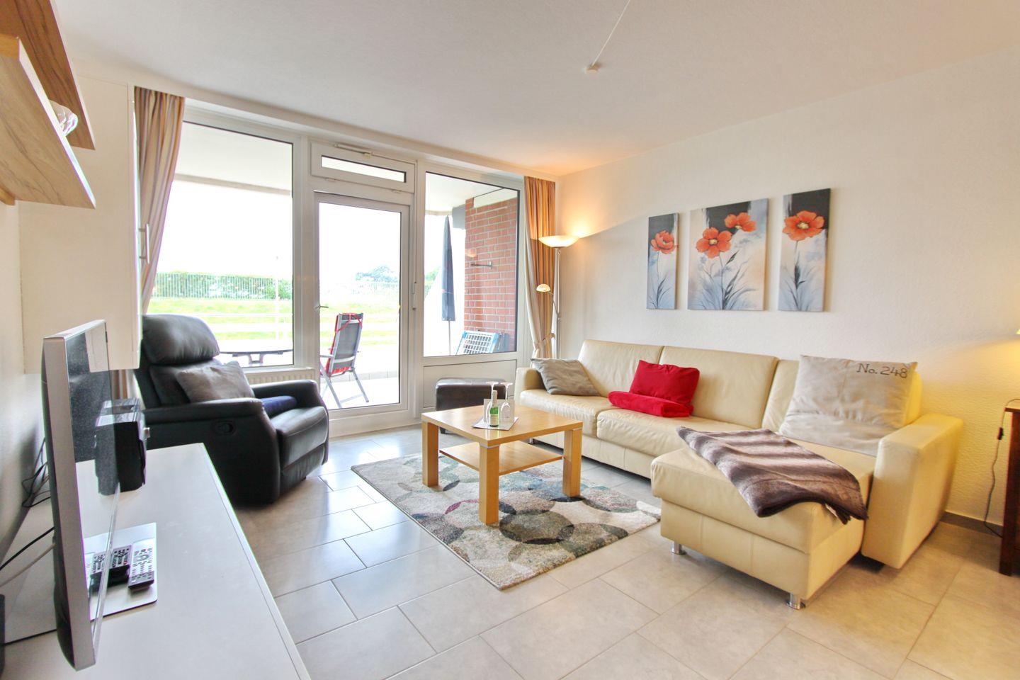 Stilvolle komplett geflieste 2-Zimmer-Wohnung in der ersten Etage mit großem möbliertem Balkon in Südrichtung in einer gepflegten Appartementanlage direkt hinter dem Deich. Genießen Sie die ruhigen Stunden auf dem Balkon und lauschen Sie dem Meer.
