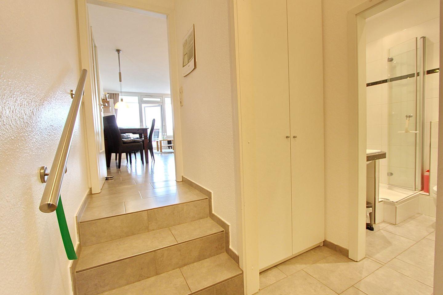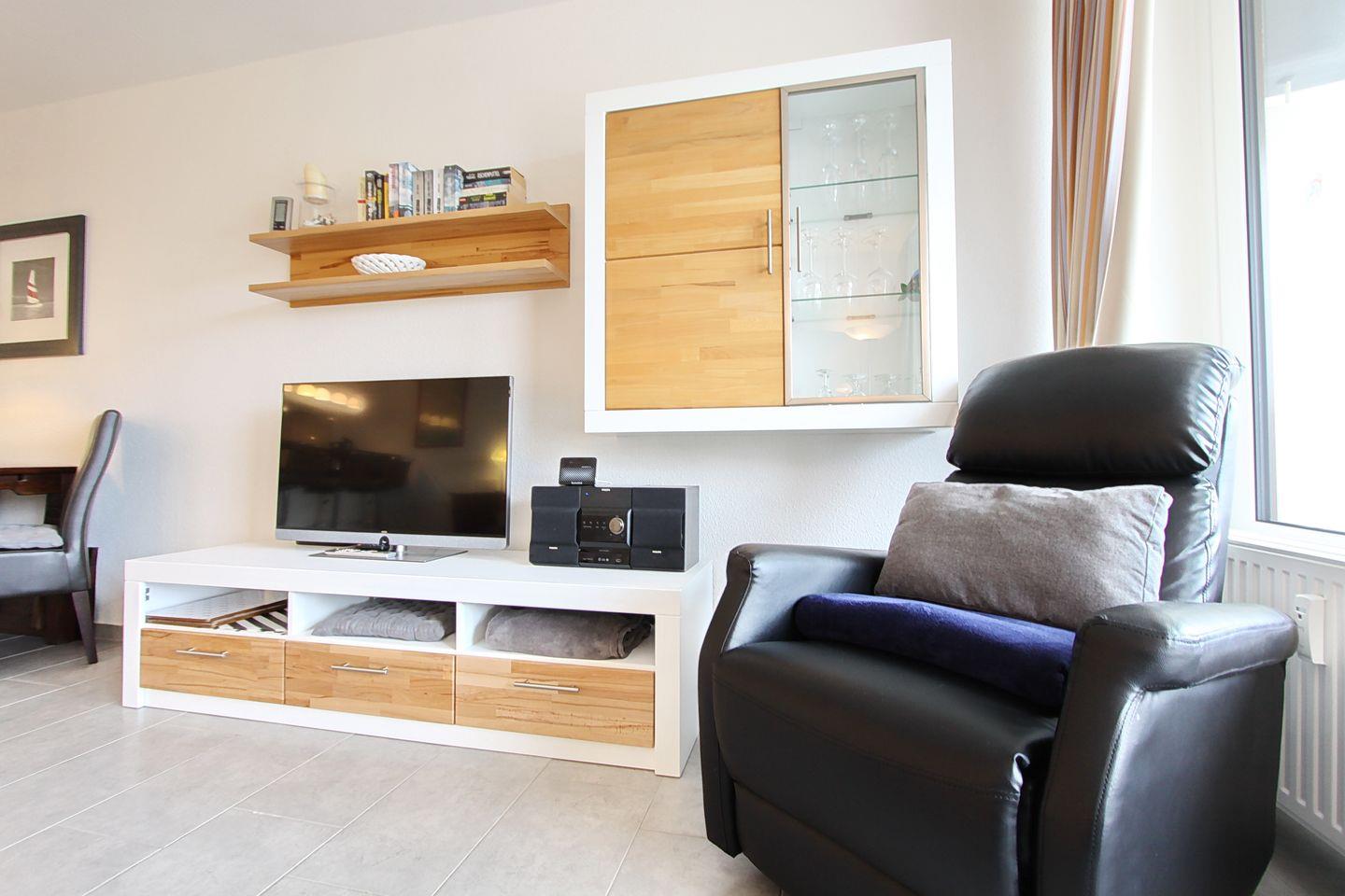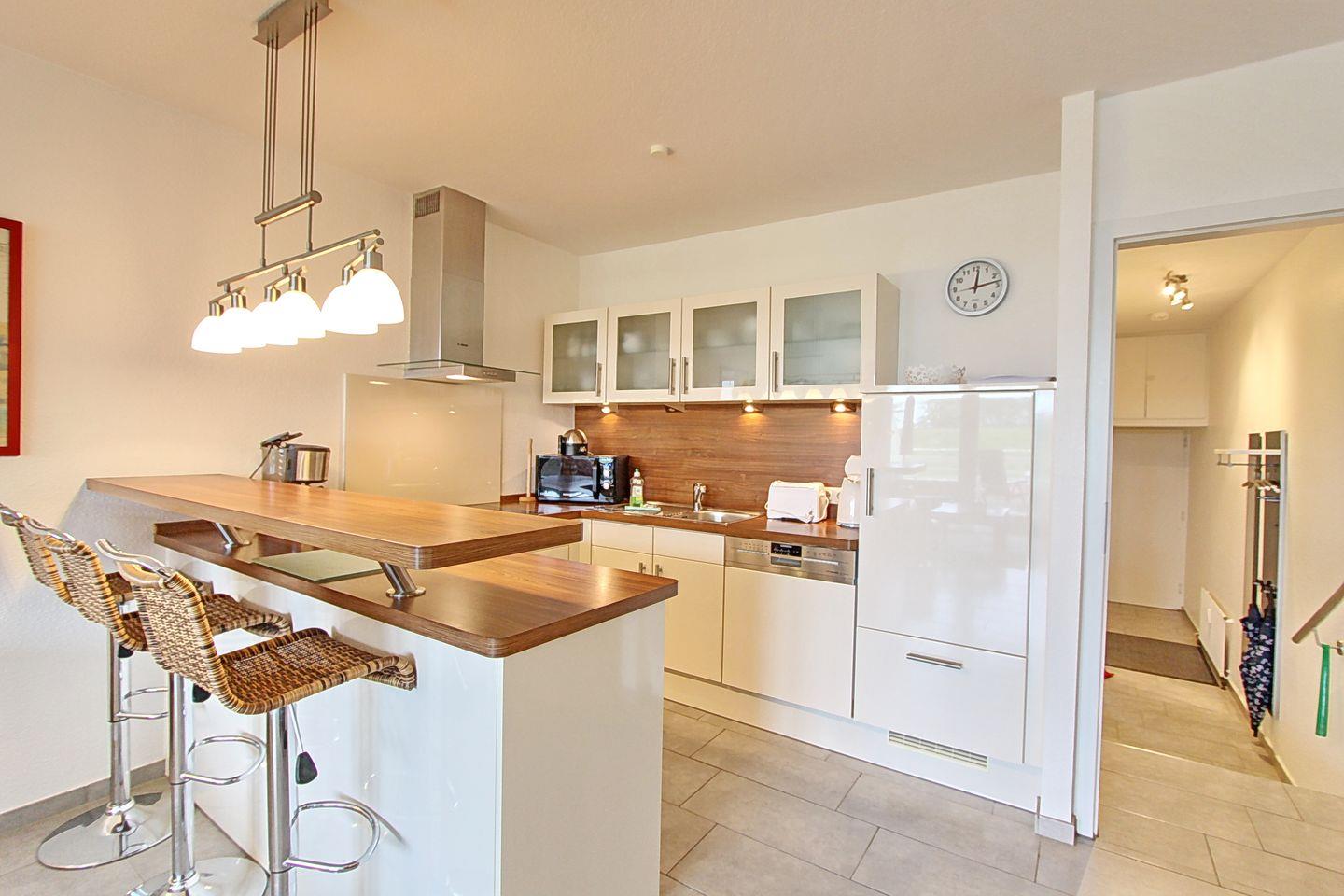 Über den Flur gelangen Sie über drei Stufen nach oben in das helle und freundlich möblierte Wohnzimmer. Hier erwartet Sie eine Schlafcouch für 1 Person, ein bequemer Fernsehsessel, ein Flatscreen, ein Radio und eine Essecke mit 4 gemütlichen Stühlen. Die offene Küchenzeile ist hell und freundlich und durch einen Tresen mit 3 Bar-Stühlen vom Wohnbereich abgetrennt. Dies ist ein toller Platz für den schnellen Kaffee zwischendurch oder ein nettes Gespräch während ein leckeres Essen gekocht wird. Sie verfügt über ein Ceranfeld mit Backofen, einen Kühlschrank, einen Geschirrspüler, eine Mikrowelle, eine Kaffeemaschine, einen Wasserkocher und einen Toaster. Im gemütlichen Schlafzimmer befinden sich ein Doppelbett, ein großer Kleiderschrank und zwei Nachttische. Außerdem gibt es im Schlafzimmer einen weiteren Flatscreen. Hier können Sie entspannt einen Krimi schauen während im Wohnzimmer eine Unterhaltungssendung läuft.