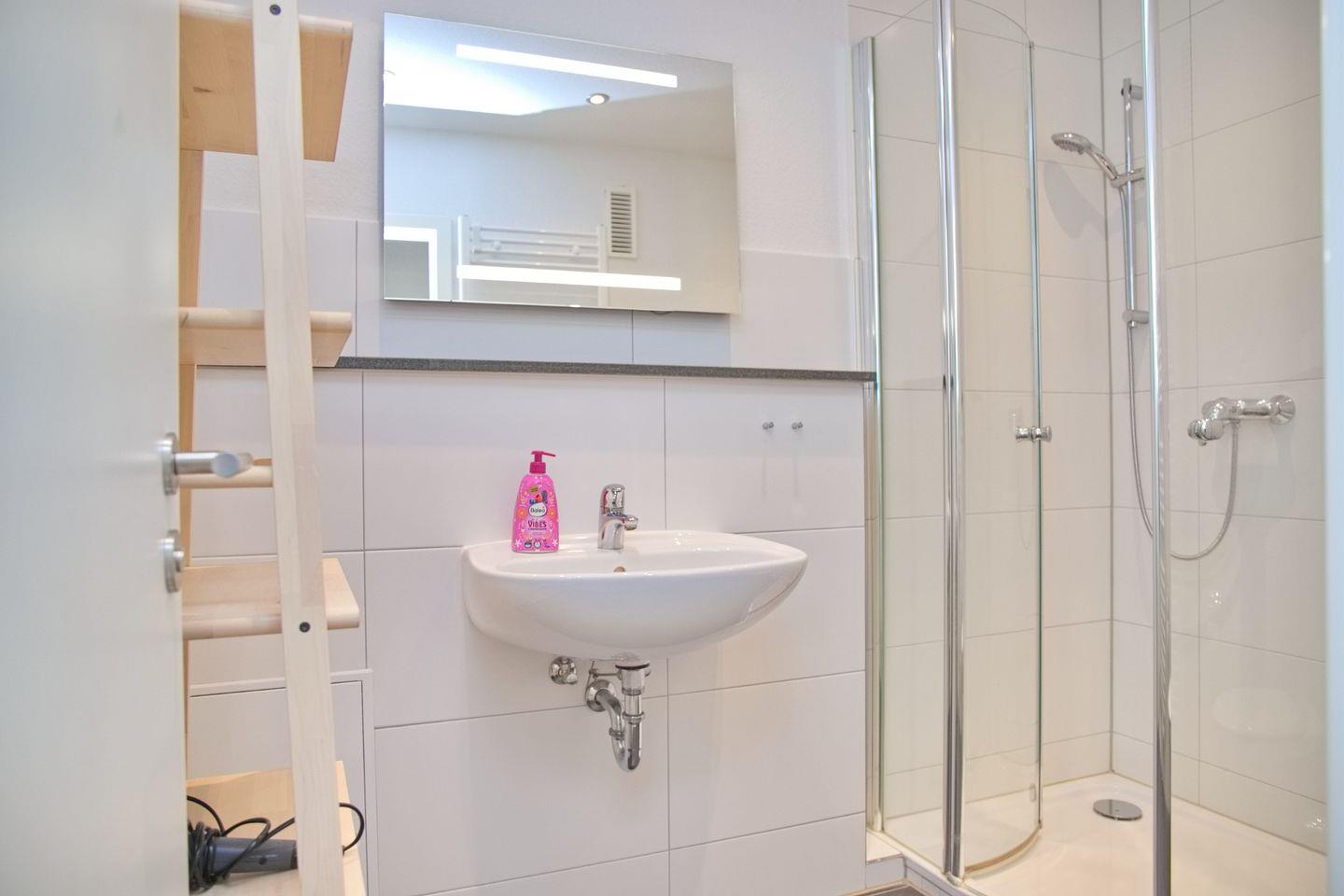 Das Schlafzimmer verfügt über komfortable Schlafmöglichkeiten. Ein weiteres Highlight der Wohnung ist das moderne Badezimmer mit Dusche, Waschbecken und WC. Für zusätzlichen Komfort sorgt die Waschmaschine, sowie die Möglichkeit, einen Trockner gemeinschaftlich zu nutzen. Sie treffen zudem auf eine praktische Garderobe und einen Wäscheständer, sodass Sie Ihre Sachen jederzeit gut verstauen können.