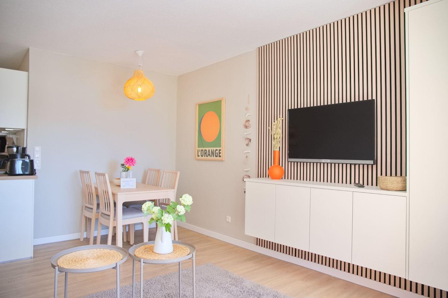 Die Unterkunft selbst befindet sich im 2. Stock eines fünfstöckigen Gebäudes und ist mit einem Aufzug zu erreichen. Der helle, einladende Wohnbereich ist mit einem bequemen Sofa, einem TV sowie einem Essbereich ausgestattet, der Platz für gemeinsame Mahlzeiten mit der Familie oder Freunden bietet. Die Kochnische ist bestens ausgestattet mit einem Cerankochfeld, Kühlschrank, Gefrierfach, Mikrowelle, Backofen, Geschirrspülmaschine, Kaffeemaschine, Toaster und Wasserkocher. Hier können Sie Ihre Lieblingsgerichte zubereiten und die frischesten Zutaten der Region verwenden.