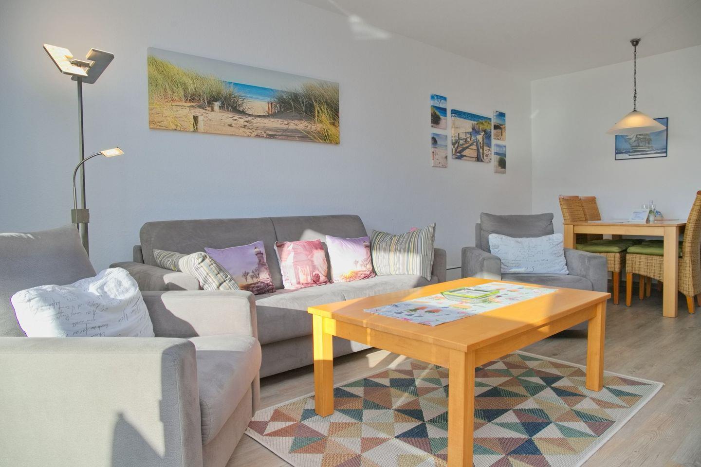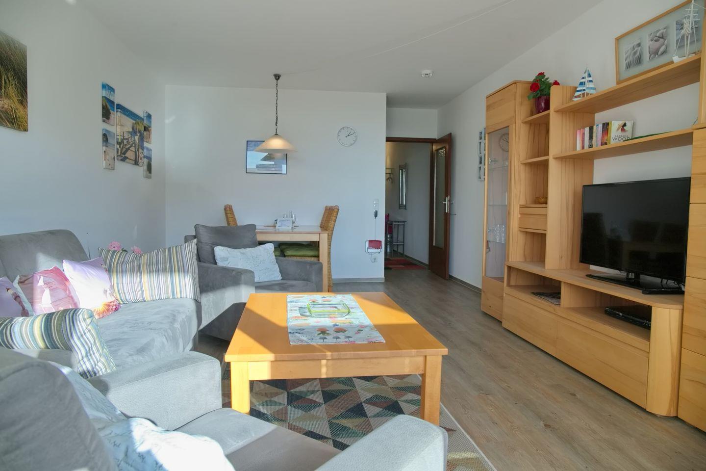 Vom Flur gelangen Sie in das liebevoll eingerichtete Wohnzimmer, dort befindet sich eine hochwertige Schlafcouch für 2 Personen, 2 Sessel, ein großer Flatscreen, Radio mit CD - Player und ein Essbereich mit 4 Stühlen.