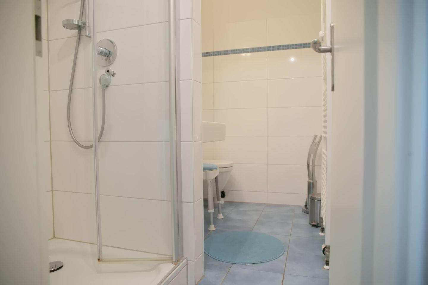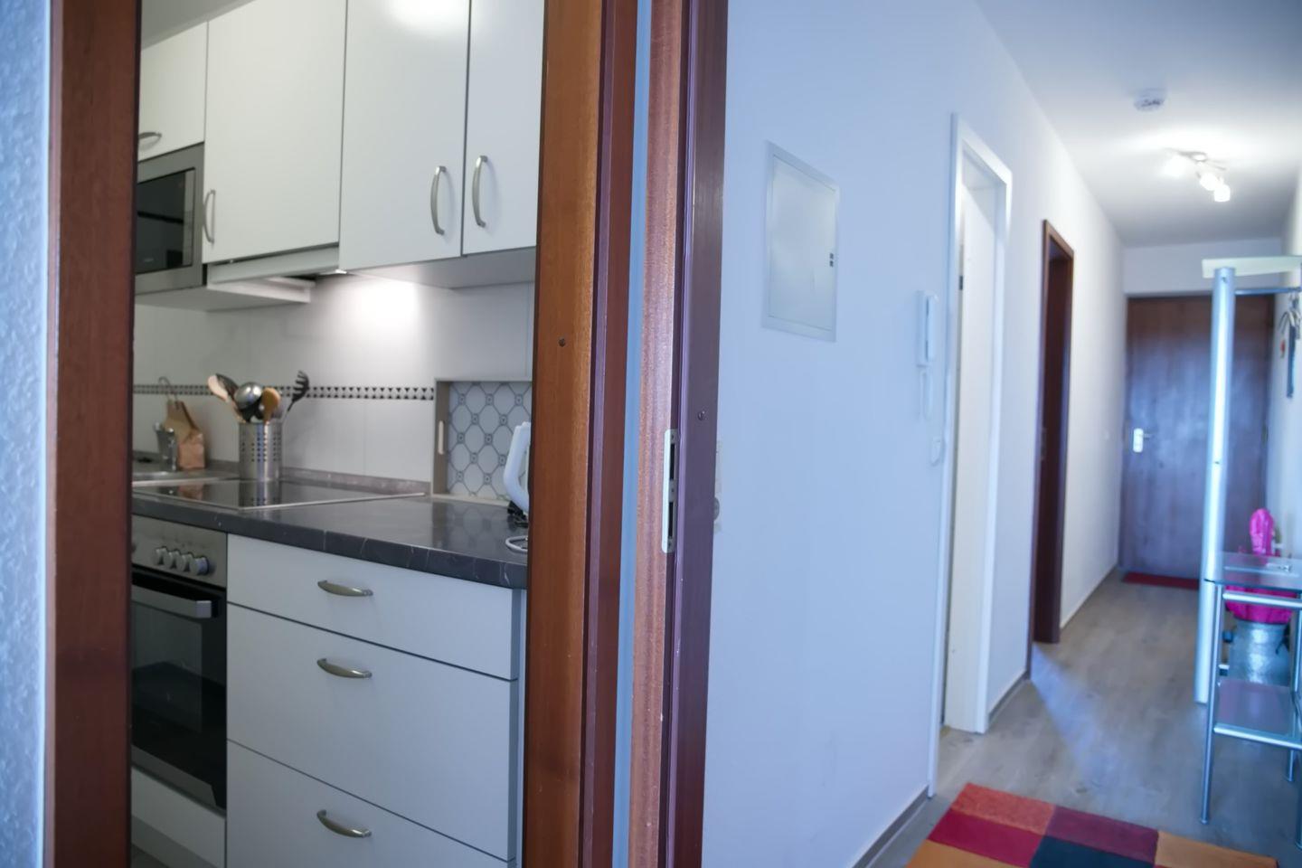 Die separate Küche ist mit einem Ceranfeld mit Backofen, Kühlschrank mit Gefrierfach, Mikrowelle, Kaffeemaschine, Wasserkocher und Toaster ausgestattet. Im gemütlichen Schlafzimmer befinden sich ein Doppelbett, zwei Nachttische und ein großer Kleiderschrank. Die Wohnung verfügt über ein modernes und helles Duschbad/WC mit niedrigem Einstieg in die Dusche .