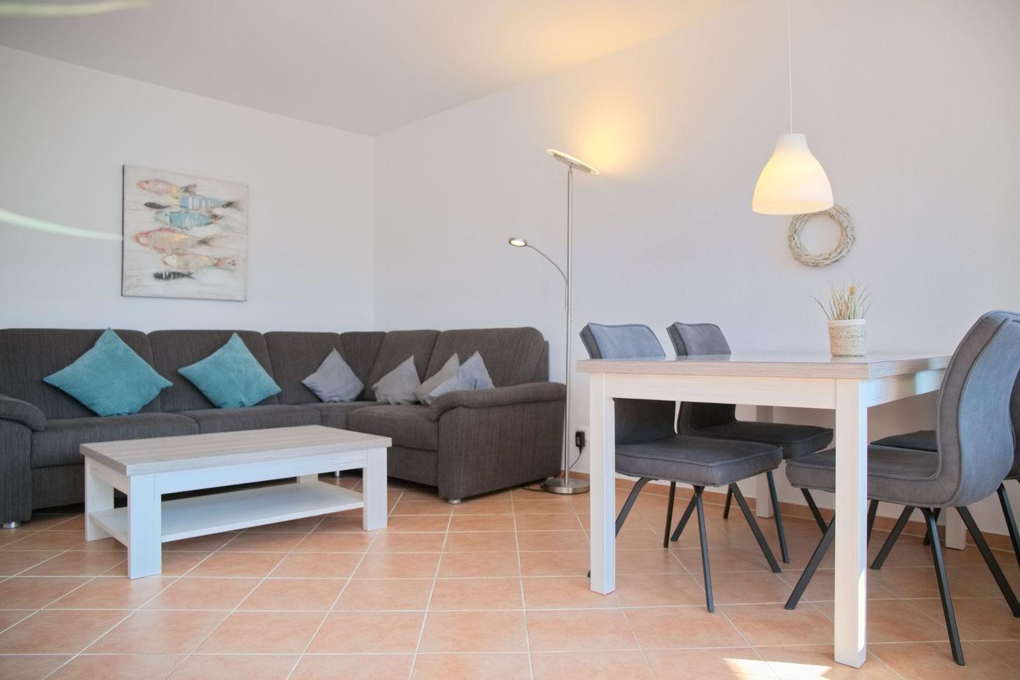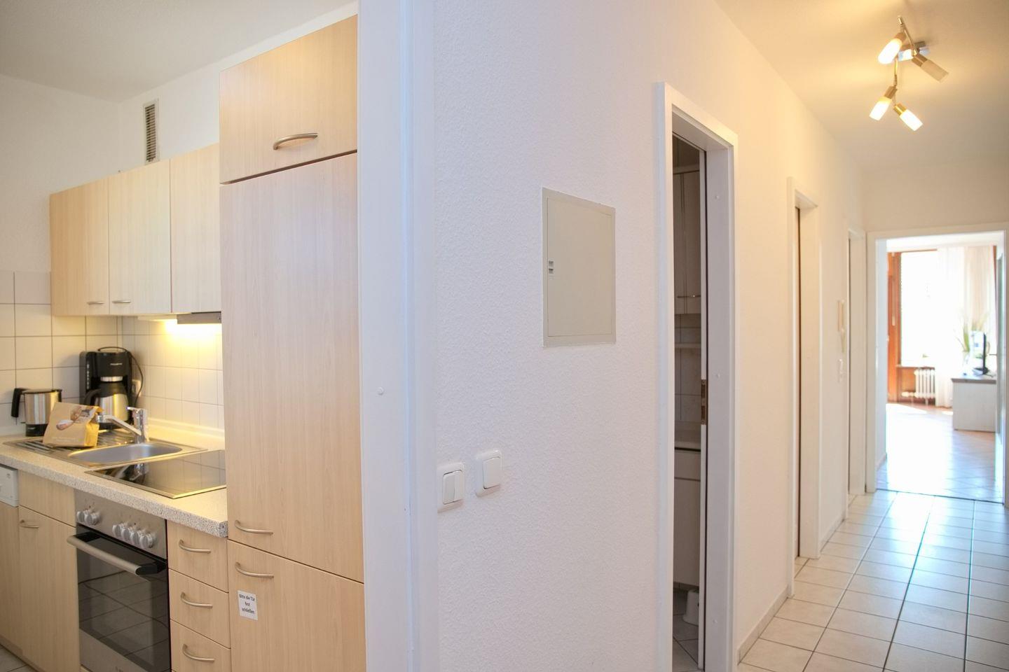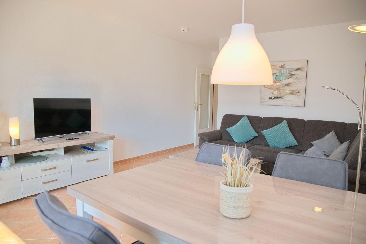 Das helle Wohnzimmer ist der zentrale Treffpunkt der Wohnung und verfügt über eine komfortable Eckcouch, einen Smart TV sowie eine gemütliche Essecke mit vier Stühlen. Von hier aus gelangen Sie direkt auf den ersten Balkon, der sich perfekt für ein Frühstück im Freien oder einen entspannten Ausklang des Tages eignet. Die separate, voll ausgestattete Küche lässt keine Wünsche offen: Ceranfeld mit Backofen, Kühlschrank mit Gefrierfach, Spülmaschine, Kaffeemaschine, Wasserkocher und Toaster sorgen dafür, dass Sie sich auch im Urlaub wie zuhause fühlen.