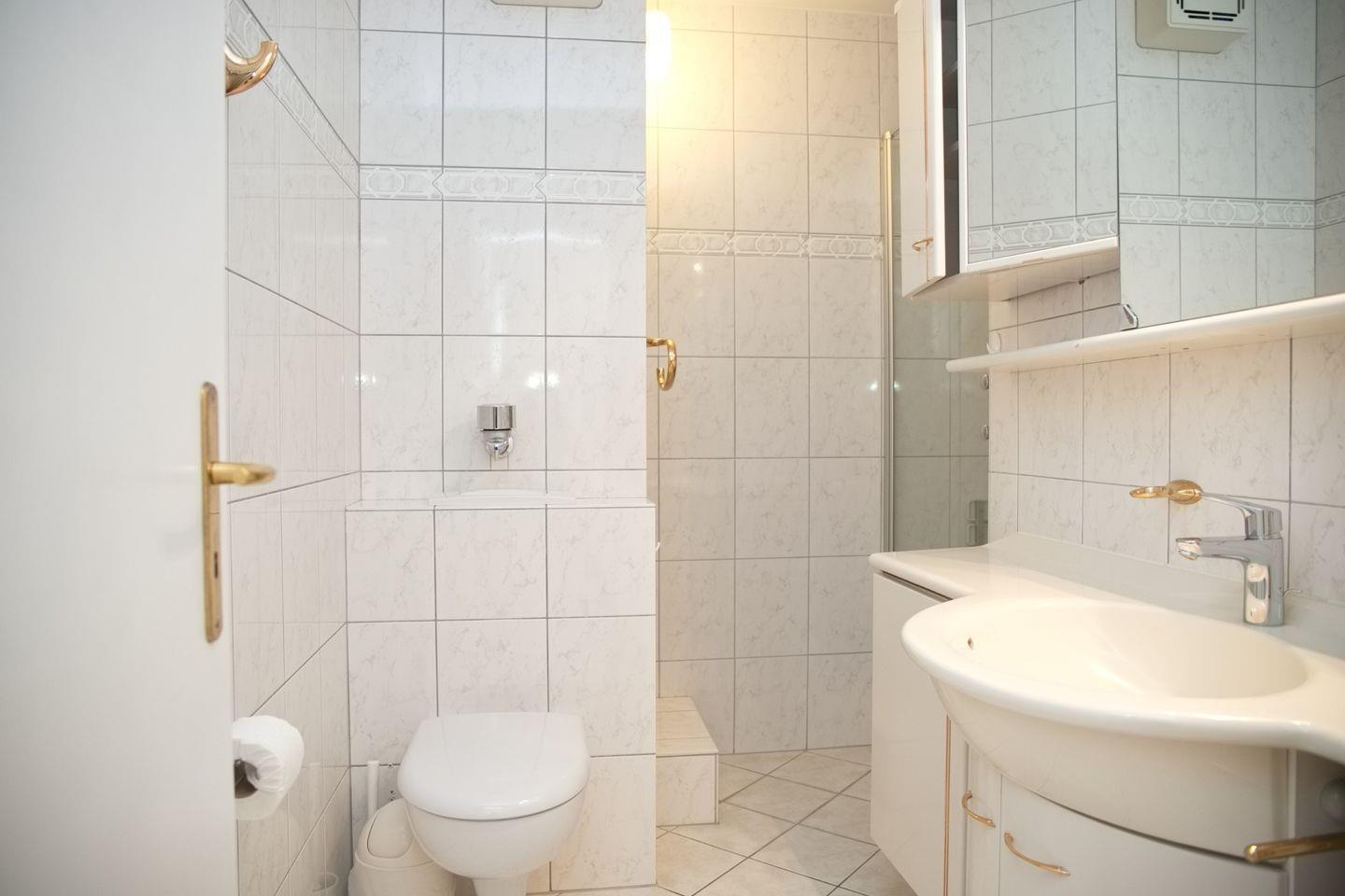 Das moderne Badezimmer verfügt über eine Dusche, ein WC, einen großen Spiegelschrank sowie einen Waschtisch und bietet ausreichend Platz für Ihre persönlichen Dinge.
