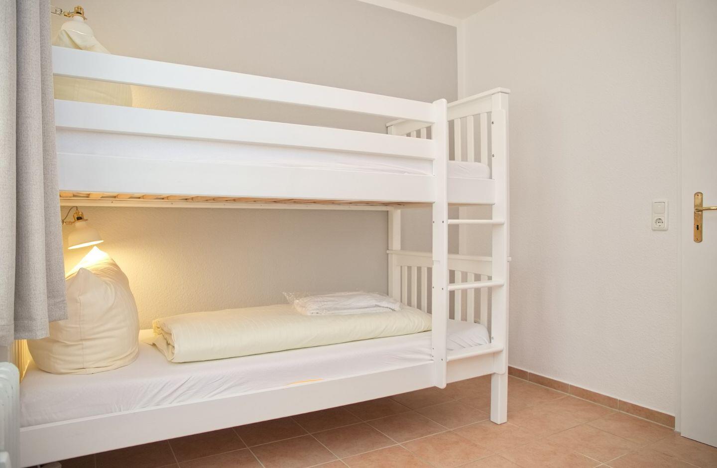 Das großzügige Schlafzimmer ist mit einem komfortablen Doppelbett, zwei Nachttischen, einem geräumigen Kleiderschrank sowie einem zusätzlichen TV ausgestattet. Verdunkelungsvorhänge sorgen für erholsamen Schlaf. Ein besonderes Highlight ist der direkte Zugang zum zweiten Balkon. Das Kinderzimmer bietet ein praktisches Etagenbett (90x200 cm), einen Kleiderschrank und ebenfalls Verdunkelungsmöglichkeiten, ideal für Familien mit Kindern.