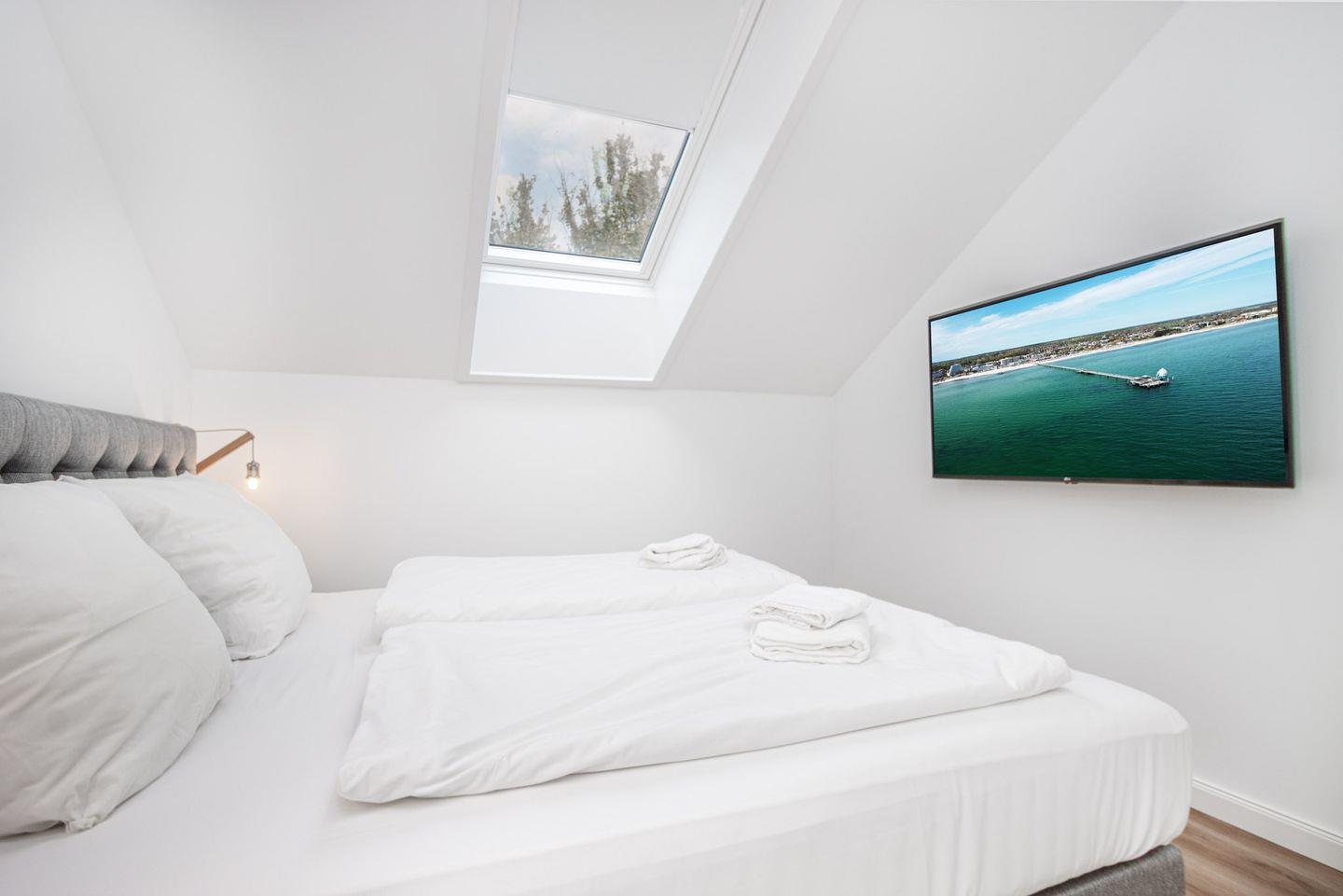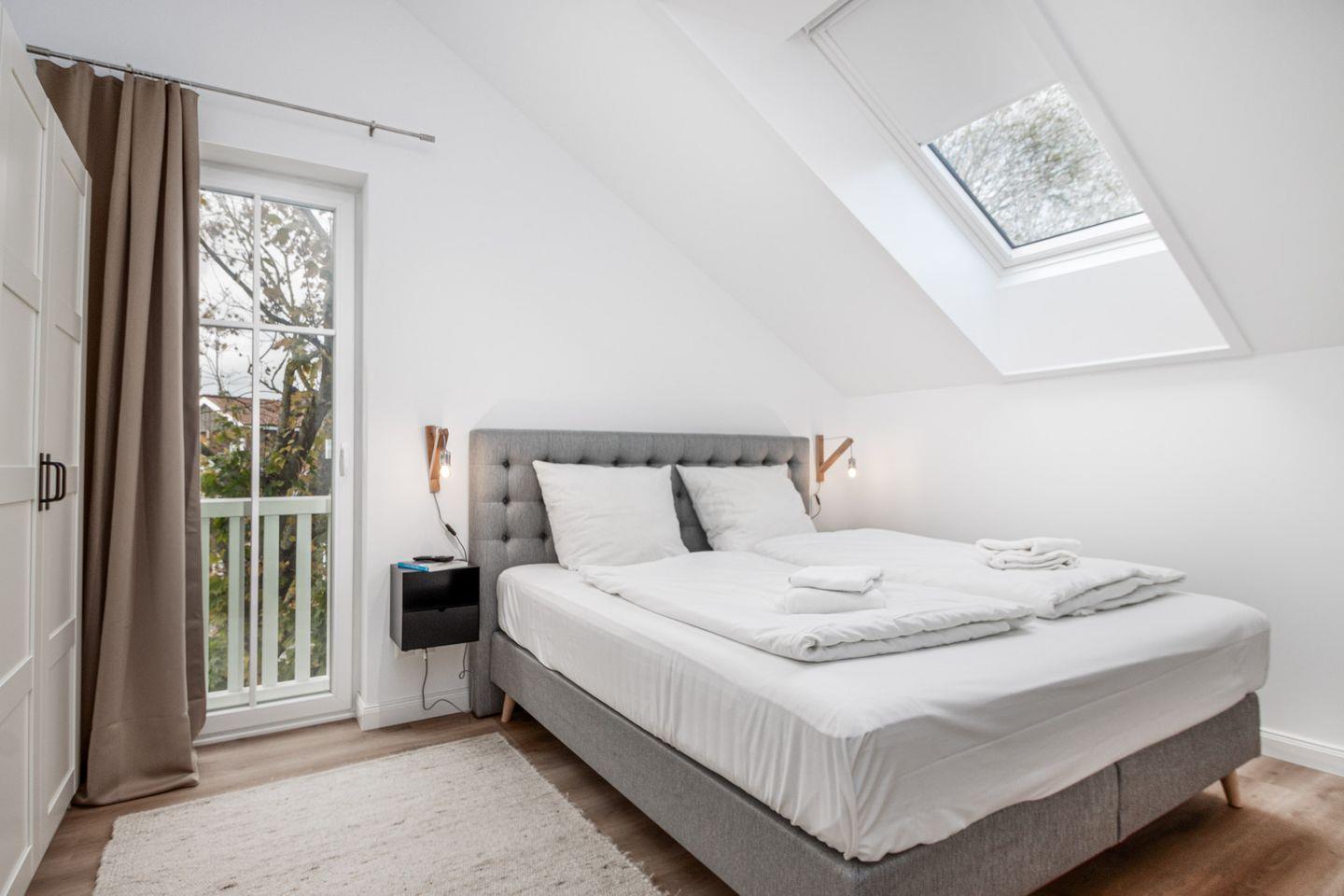 Das Schlafzimmer verfügt über ein luxuriöses Boxspringbett mit einem durchgehenden Topper für erholsame Nächte. Ein Smart-TV, ein geräumiger Kleiderschrank und Verdunkelungsgardinen runden das Angebot ab.