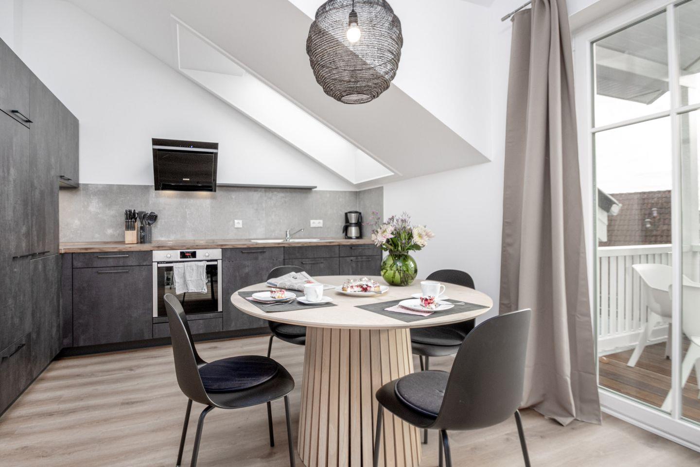 Die offene Küche ist komplett ausgestattet mit modernen Geräten wie einem Induktionskochfeld, einem Backofen, einer Spülmaschine, einem Kühlschrank mit Gefrierfach, einem Wasserkocher, einem Toaster und einer Kaffeemaschine.