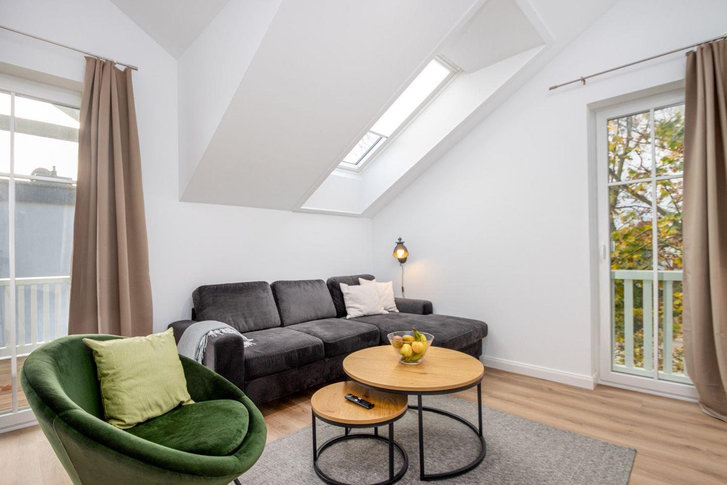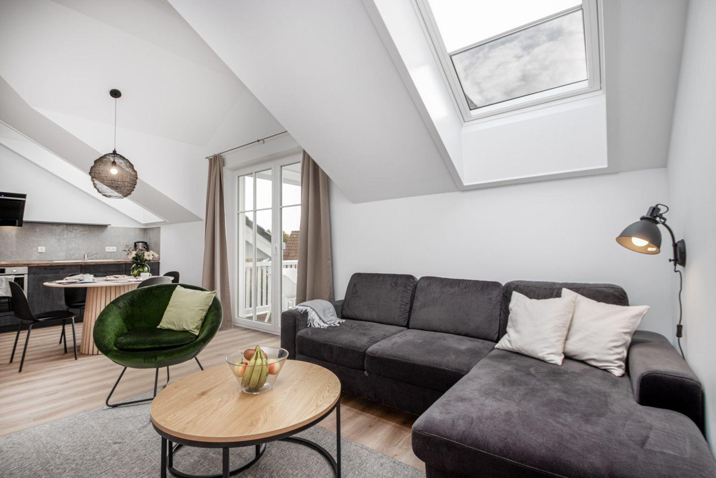 Das Wohnzimmer lädt zum Entspannen ein, mit einer komfortablen Schlafcouch, die tagsüber als gemütliches Sofa dient und nachts zu einem großzügigen Bett für zwei Personen umgewandelt werden kann. Ein Sessel und ein Smart-TV sorgen für zusätzlichen Komfort und Unterhaltung.
