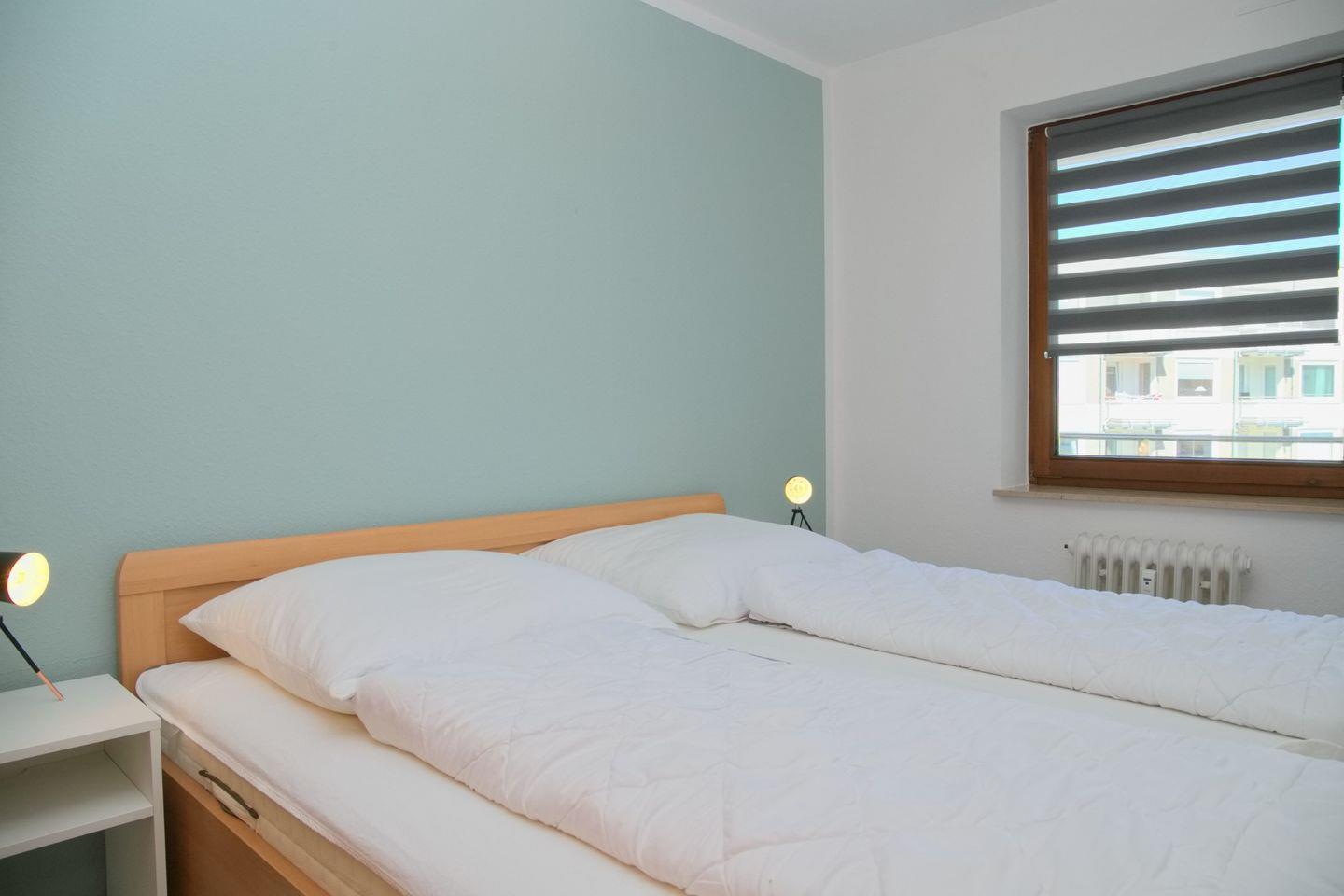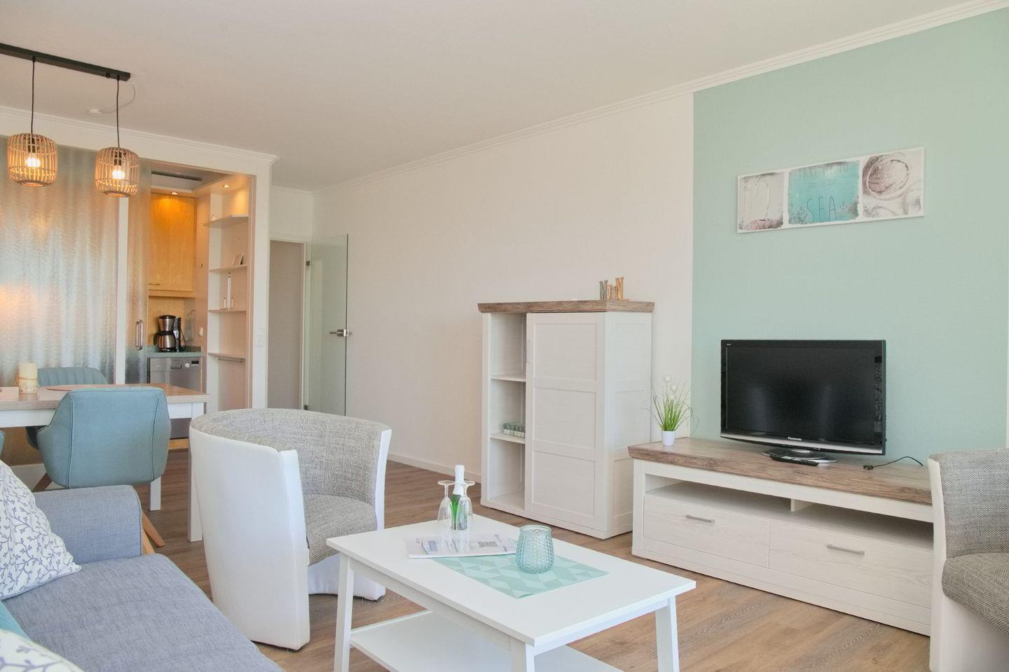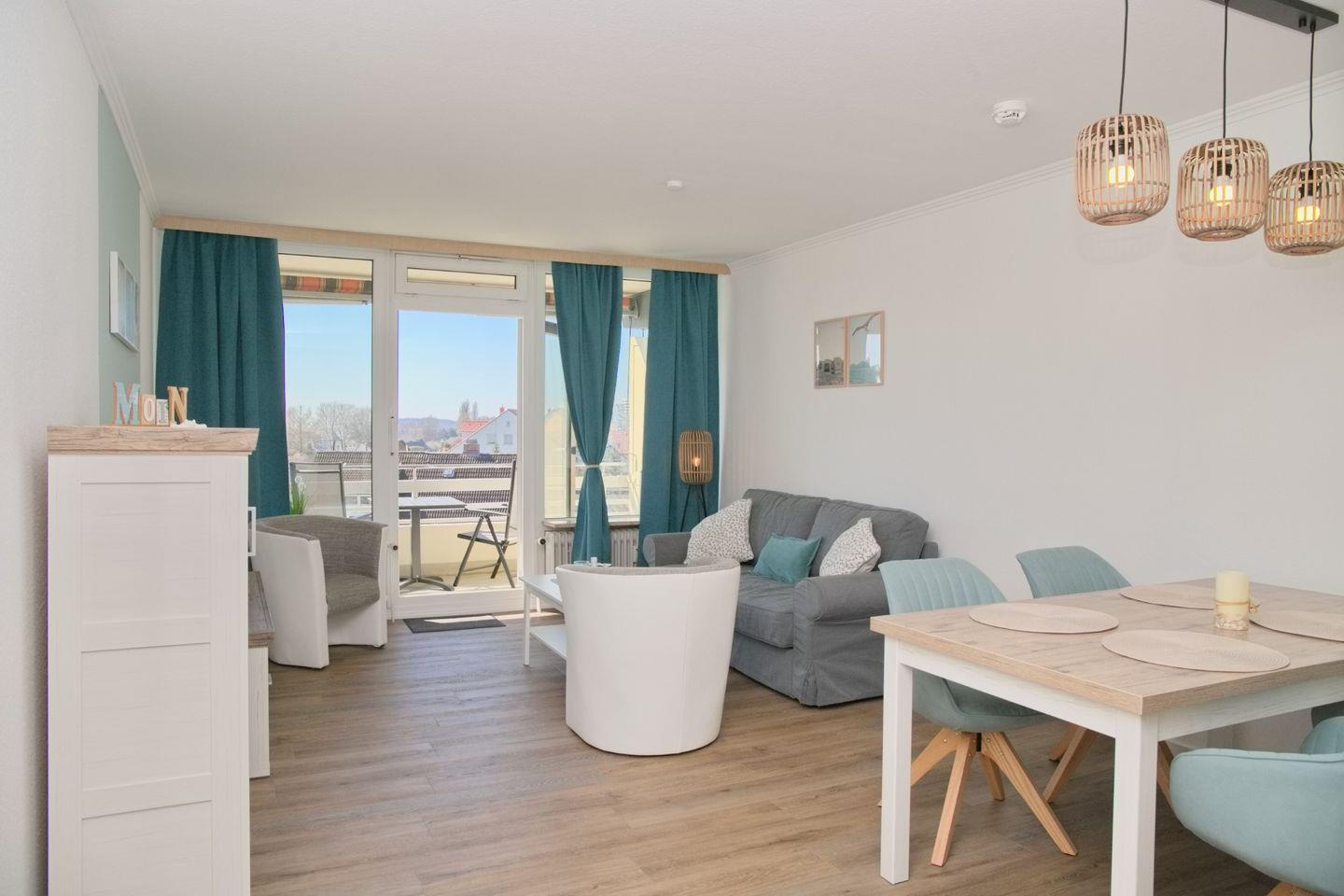 Schicke 2-Zimmer-Wohnung (ca. 52 qm) in der 3. Etage mit möbliertem Balkon in Südwestlage. Im Wohnzimmer gibt es eine Schlafcouch für 2 Personen (140 x 200 cm), 2 kleine Sessel, einen Flatscreen, ein Radio, und einen Essbereich für 4 Personen. Die Küche ist mit einem Ceranfeld mit Backofen, Kühlschrank mit Gefrierschrank, einer Spülmaschine, einer Kaffeemaschine, Wasserkocher und Toaster ausgestattet. Das Schlafzimmer ist durch 2 Türen begehbar, hier befindet sich ein Doppelbett, zwei Nachttische und ein Kleiderschrank. Die Wohnung verfügt über ein begehbare Dusche und WC.