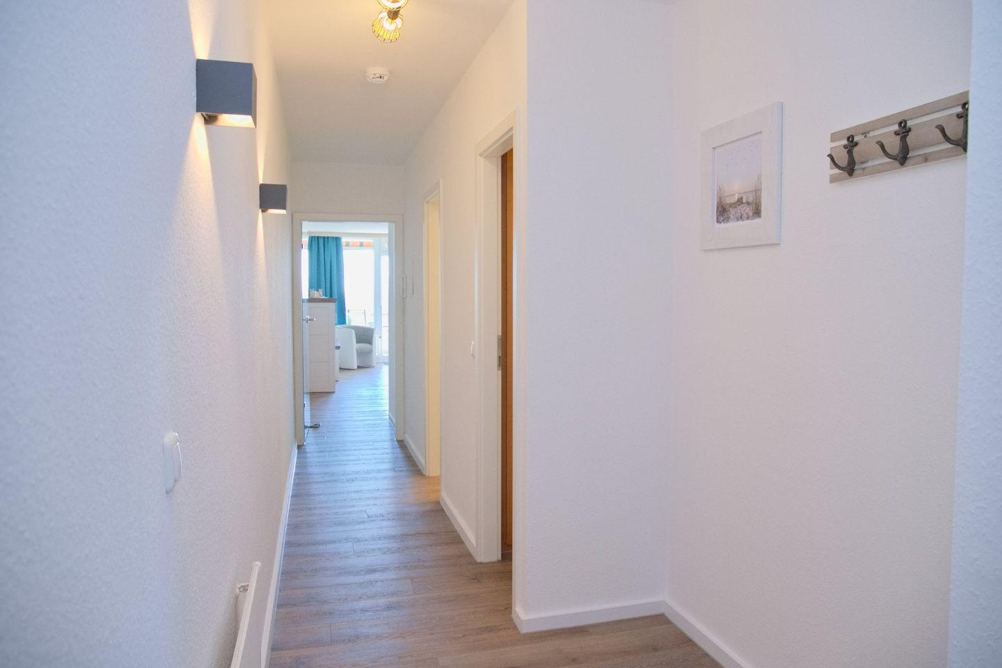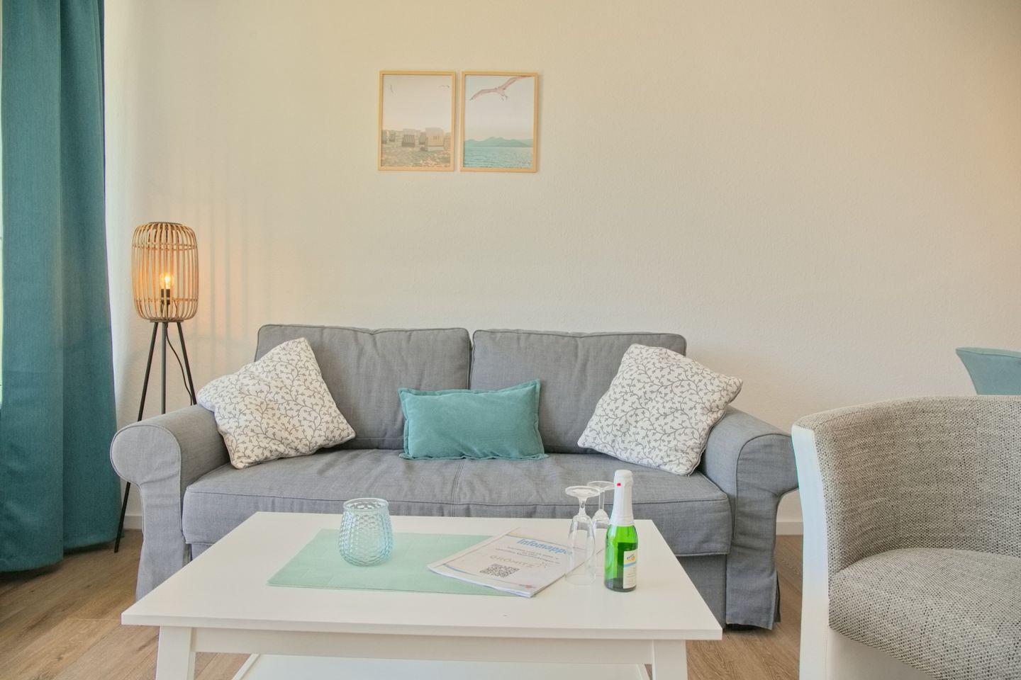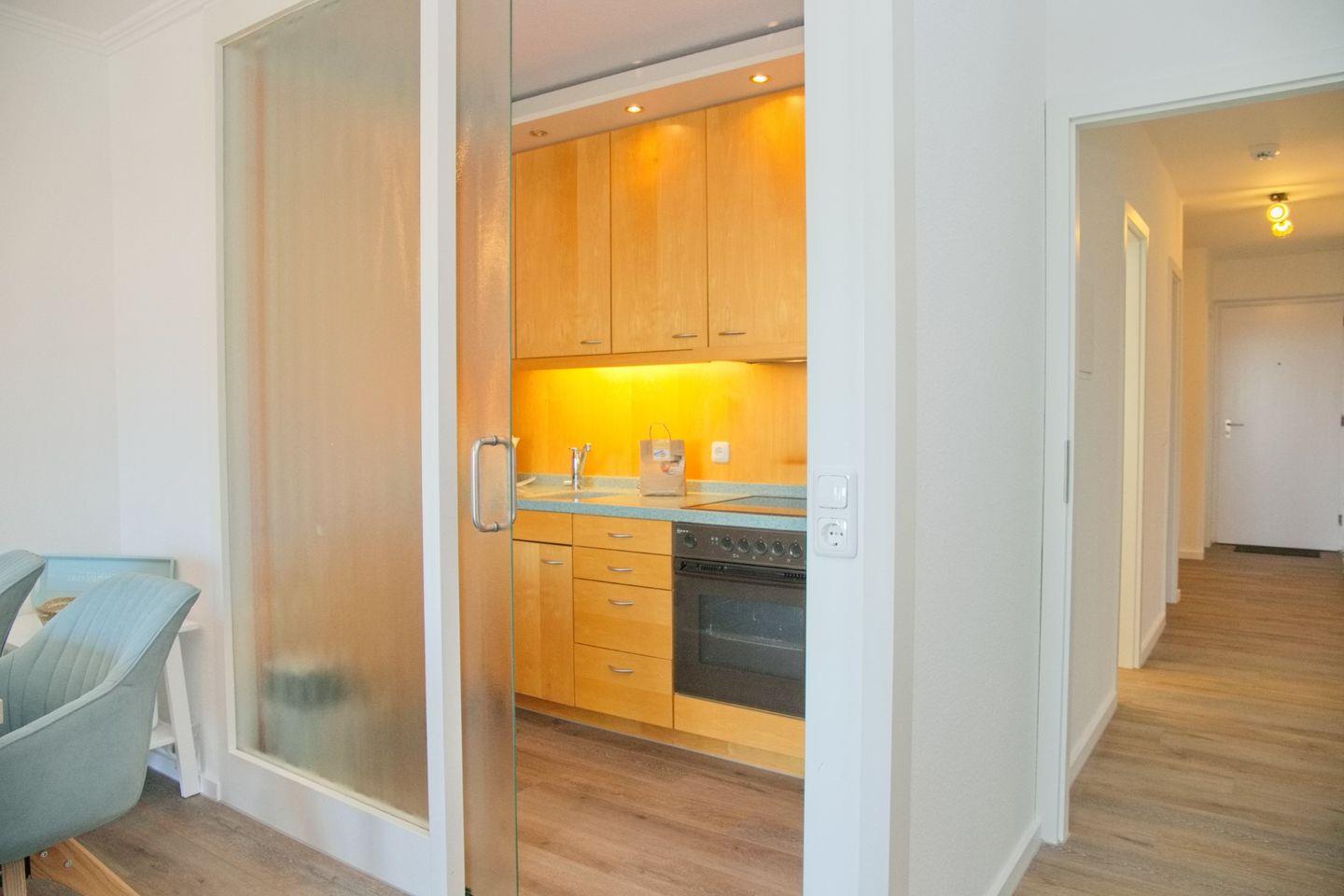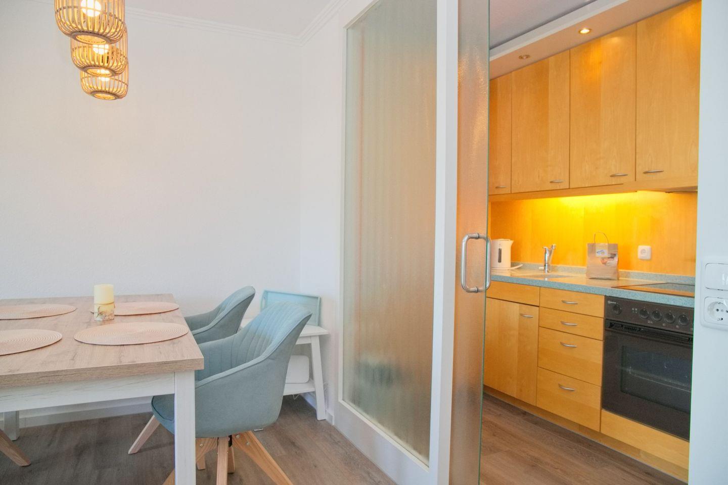 Schicke 2-Zimmer-Wohnung (ca. 52 qm) in der 3. Etage mit möbliertem Balkon in Südwestlage. Im Wohnzimmer gibt es eine Schlafcouch für 2 Personen (140 x 200 cm), 2 kleine Sessel, einen Flatscreen, ein Radio, und einen Essbereich für 4 Personen. Die Küche ist mit einem Ceranfeld mit Backofen, Kühlschrank mit Gefrierschrank, einer Spülmaschine, einer Kaffeemaschine, Wasserkocher und Toaster ausgestattet. Das Schlafzimmer ist durch 2 Türen begehbar, hier befindet sich ein Doppelbett, zwei Nachttische und ein Kleiderschrank. Die Wohnung verfügt über ein begehbare Dusche und WC.