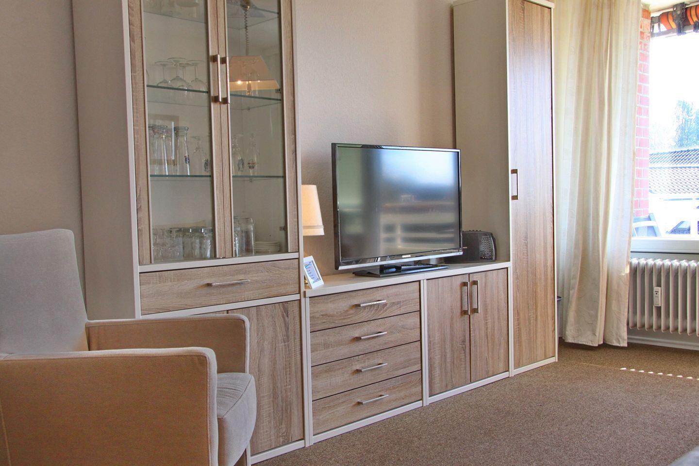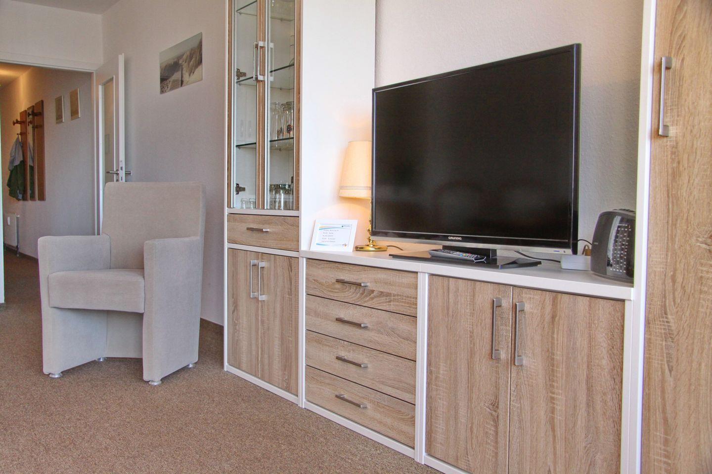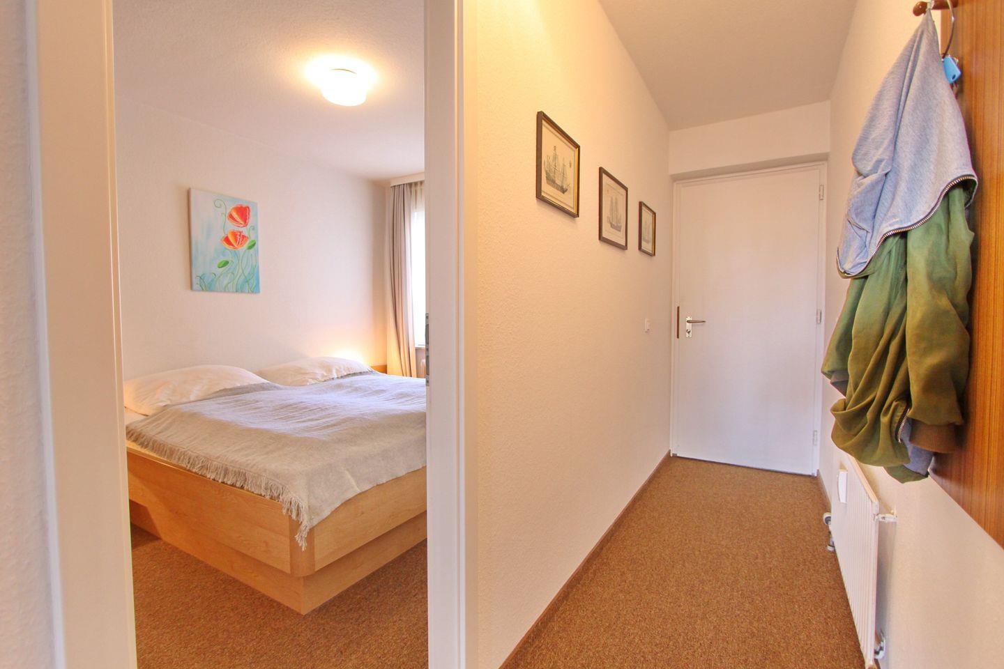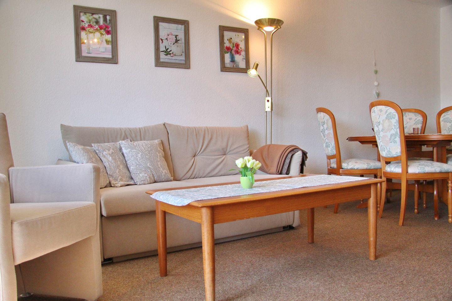 Im Wohnzimmer gibt es eine Schlafcouch für 2 Personen, einen 2-Sitzer und einen Sessel, ein Flach-TV und eine Essecke mit 4 Stühlen an dem Sie Ihren Urlaubstag mit einem ausgiebigen Frühstück starten können oder den Urlaub bei einem gemütlichen Spieleabend ausklingen lassen können. Kostenloses WLAN steht Ihnen in dieser Wohnung zur Verfügung. Die offene, neue Küche ist ausgestattet mit einem Ceranfeld, Kühlschrank mit Gefrierfach, einer Mikrowelle einer Kaffeemaschine, Wasserkocher und Toaster. Im Schlafzimmer befinden sich ein Doppelbett, Kleiderschrank und zwei Nachttische. Die Wohnung verfügt über ein neues modernes Duschbad/WC.
