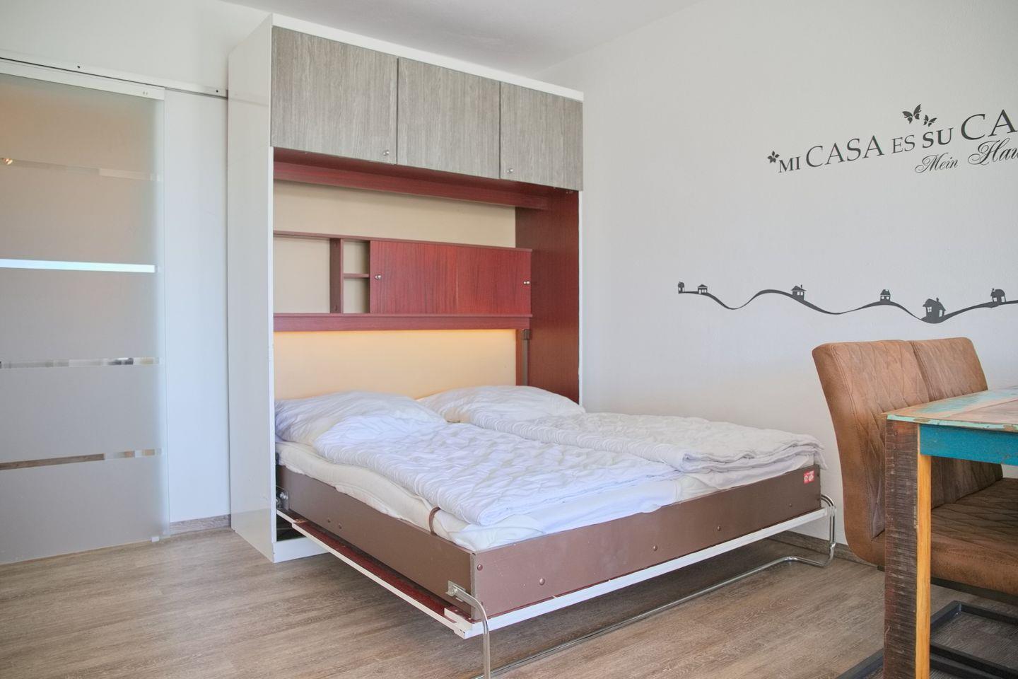 Das Wohnzimmer mit gemütlicher Sofaecke und Fernseher bietet den idealen Rückzugsort, um nach einem aufregenden Tag am Strand zu entspannen. Von hier aus gelangen Sie auf den überdachten Balkon, auf dem Sie zum Frühstück den Blick auf das glitzernde Meer genießen können. Das Schlafzimmer ist hell und einladend und bietet zwei komfortable Schlafmöglichkeiten für zwei Personen. Für zusätzlichen Schlafkomfort sorgt das Schrankbett im Wohnzimmer, das Platz für weitere zwei Personen bietet.
