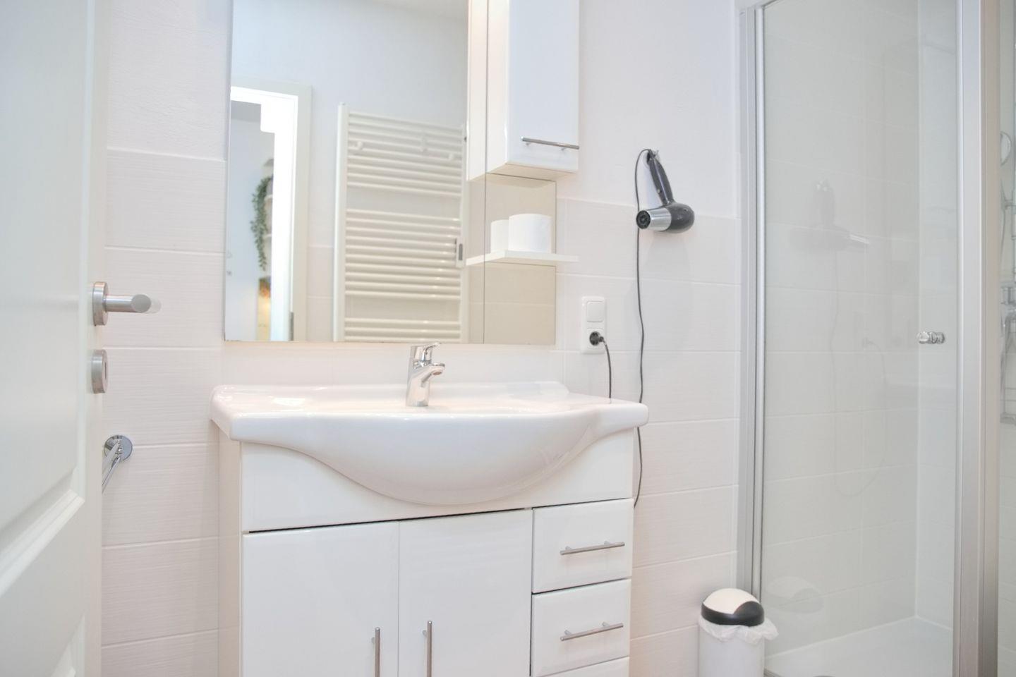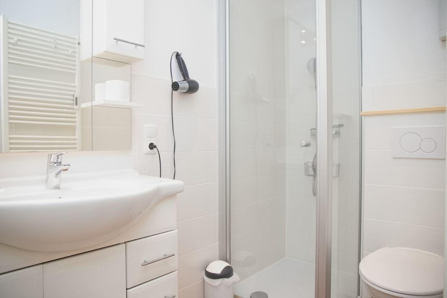 Die Ferienwohnung verfügt außerdem über ein modernes Badezimmer mit Dusche, WC und Waschbecken. Im Waschkeller des Hauses verfügen Sie über eine Waschmaschine sowie einen Trockner, die gemeinschaftlich genutzt werden können.