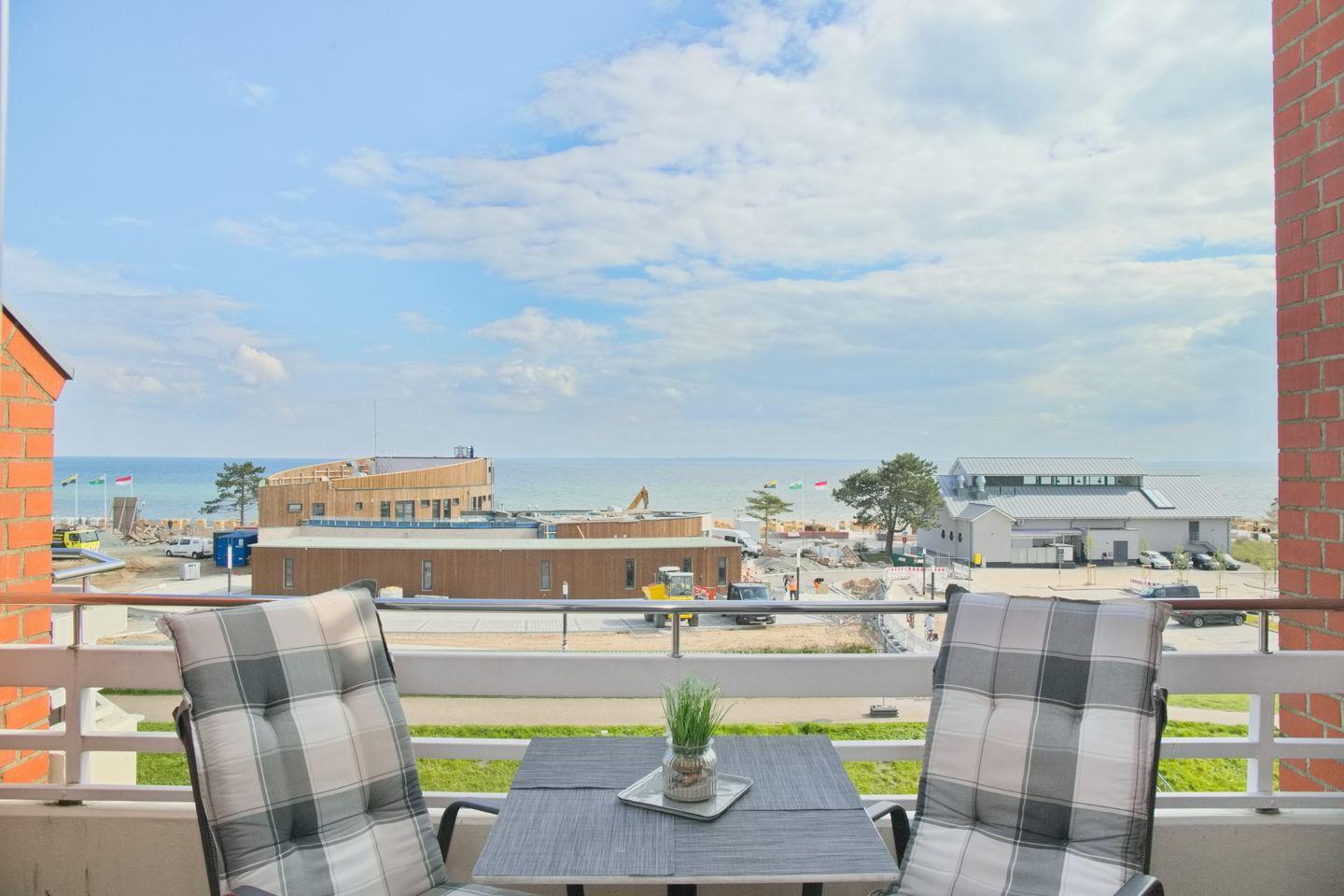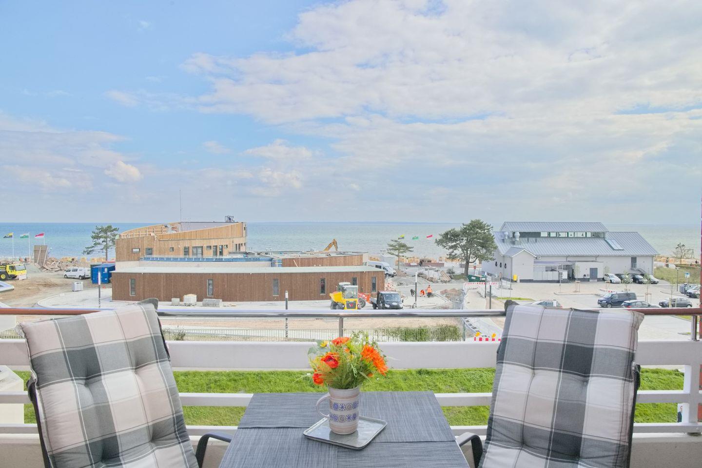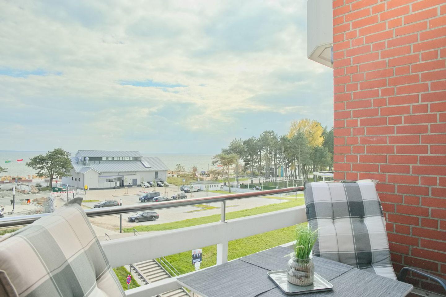 Moderne Ferienwohnung mit möbliertem Süd-Balkon, WLAN und traumhaftem Seeblick, nur 130 m vom feinen Sandstrand in Grömitz entfernt.