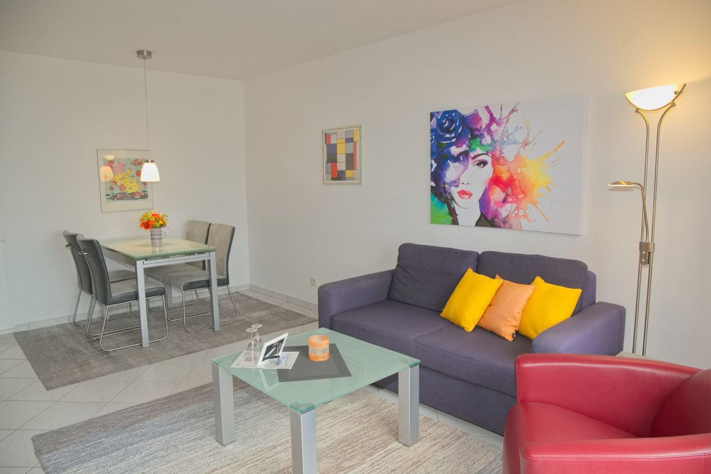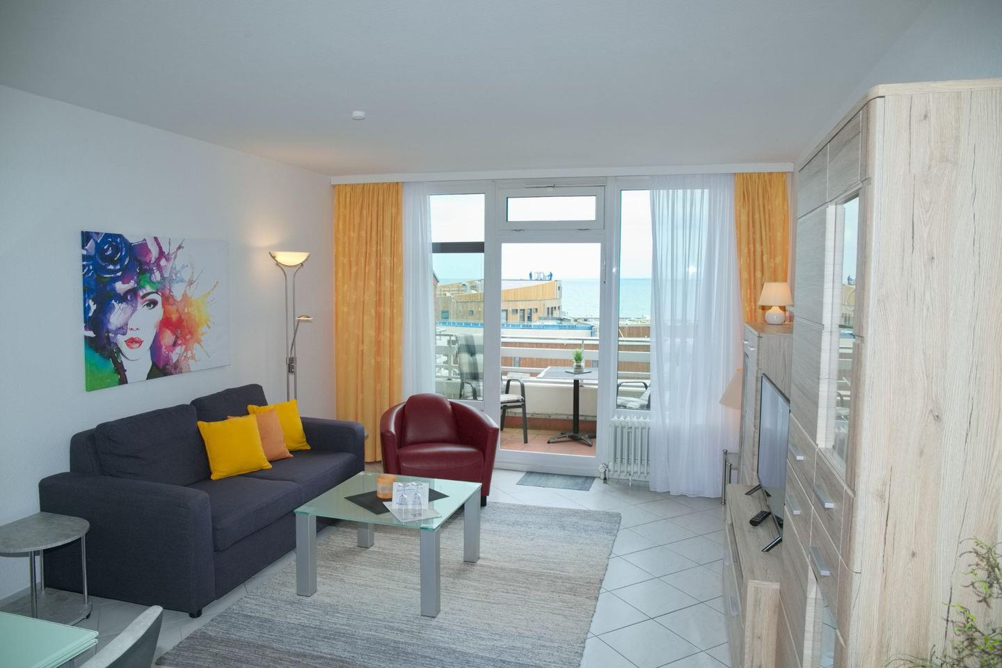 Sehr schöne 2-Zimmer-Wohnung in der 4. Etage mit möbliertem Balkon in Südrichtung, einem traumhaften Meerblick mit Markise. Im Wohnzimmer gibt es eine Schlafcouch für 2 Personen, großer Flach-TV (123 cm) und DVD, Radio mit CD-Player sowie kostenloser Internetzugang ab mitte Mai für unsere Gäste während Ihres Aufenthaltes. An der Essecke mit 4 Stühlen können Sie Ihren Urlaubstag genussvoll bei einem selbst gekochten Essen ausklingen lassen. Die Küche ist mit einem 4-Plattenherd, einem Kühlschrank mit Gefrierfach, einer Spülmaschine, einer Mikrowelle, einer Kaffeemaschine, einem Wasserkocher und einem Toaster ausgestattet. Im Schlafzimmer befinden sich ein Doppelbett, zwei Nachttische und ein Kleiderschrank. Die Wohnung verfügt über ein Duschbad/WC.