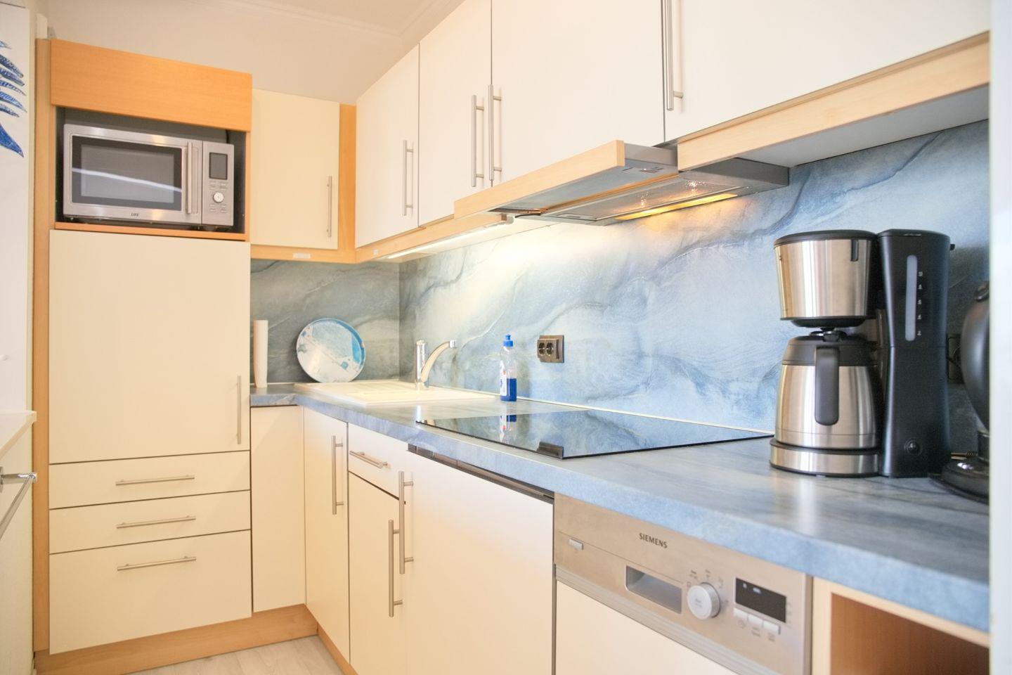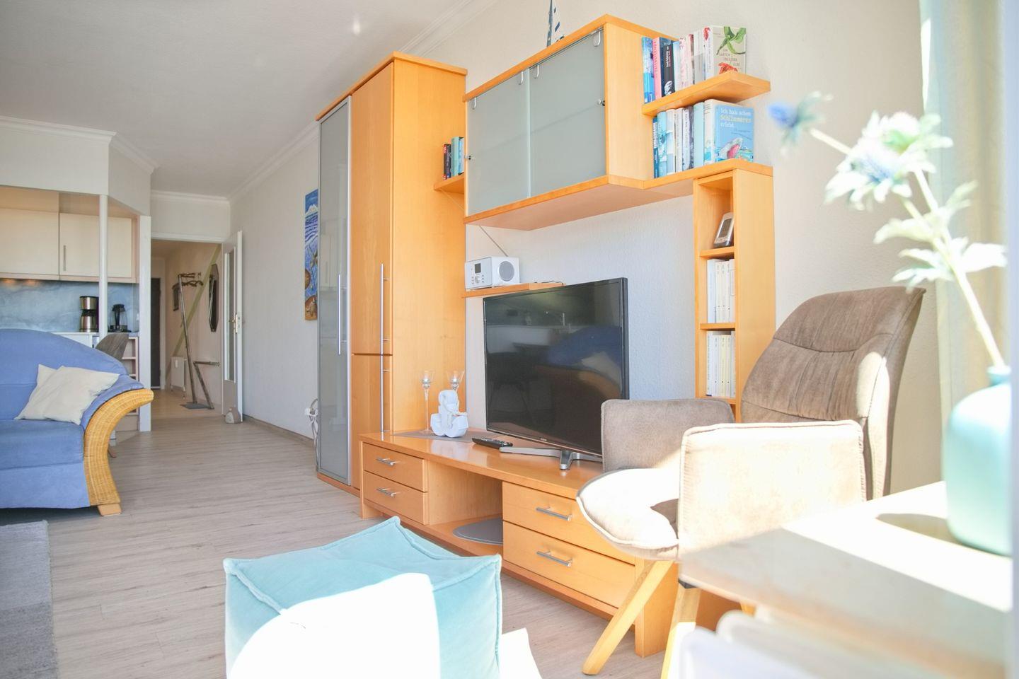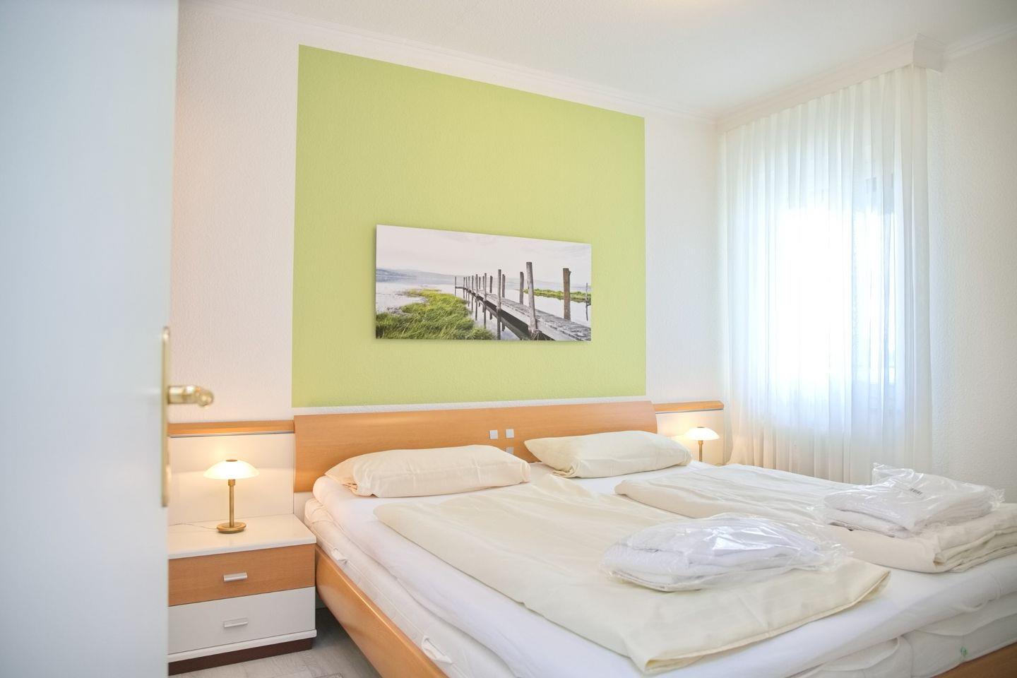 Eine gemütliche 2-Zimmer-Wohnung (ca. 52 qm) in der 4. Etage mit möbliertem Balkon in Südrichtung mit Markise und traumhaftem Seeblick. Im Wohnzimmer gibt es eine Schlafcouch für eine Person, einen 2 Sitzer und einen Sessel, Flach- TV mit HD Programmen, ein Radio mit CD-Player und eine Essecke mit 4 Stühlen. Die Küche ist mit einem Induktionsherd, einem Kühlschrank mit Gefrierfach, einer Spülmaschine, einer Mikrowelle, einer Kaffeemaschine, einem Wasserkocher und einem Toaster ausgestattet. Im Schlafzimmer befinden sich ein Doppelbett, zwei Nachttische und ein großer Kleiderschrank. Außenrollläden sorgen für einen tiefen Schlaf. Die Wohnung verfügt über ein Duschbad/WC und kostenlosem WLAN.