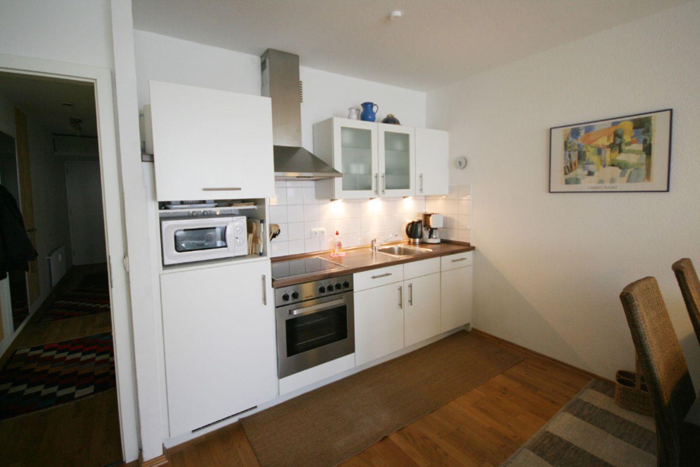 Die offene Küchenzeile ist mit einemCeranankochfeld mit Backofen, einem Kühlschrank mit Gefrierfach, einer Spülmaschine, einer Mikrowelle, einer Kaffeemaschine, einem Wasserkocher und einem Toaster ausgestattet. Im Schlafzimmer befinden sich ein Doppelbett(2x90x200), zwei Nachttische und ein Kleiderschrank. Die Wohnung verfügt über ein Duschbad/WC.