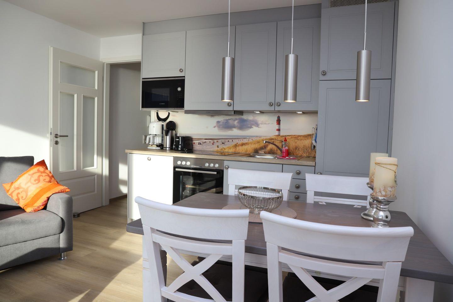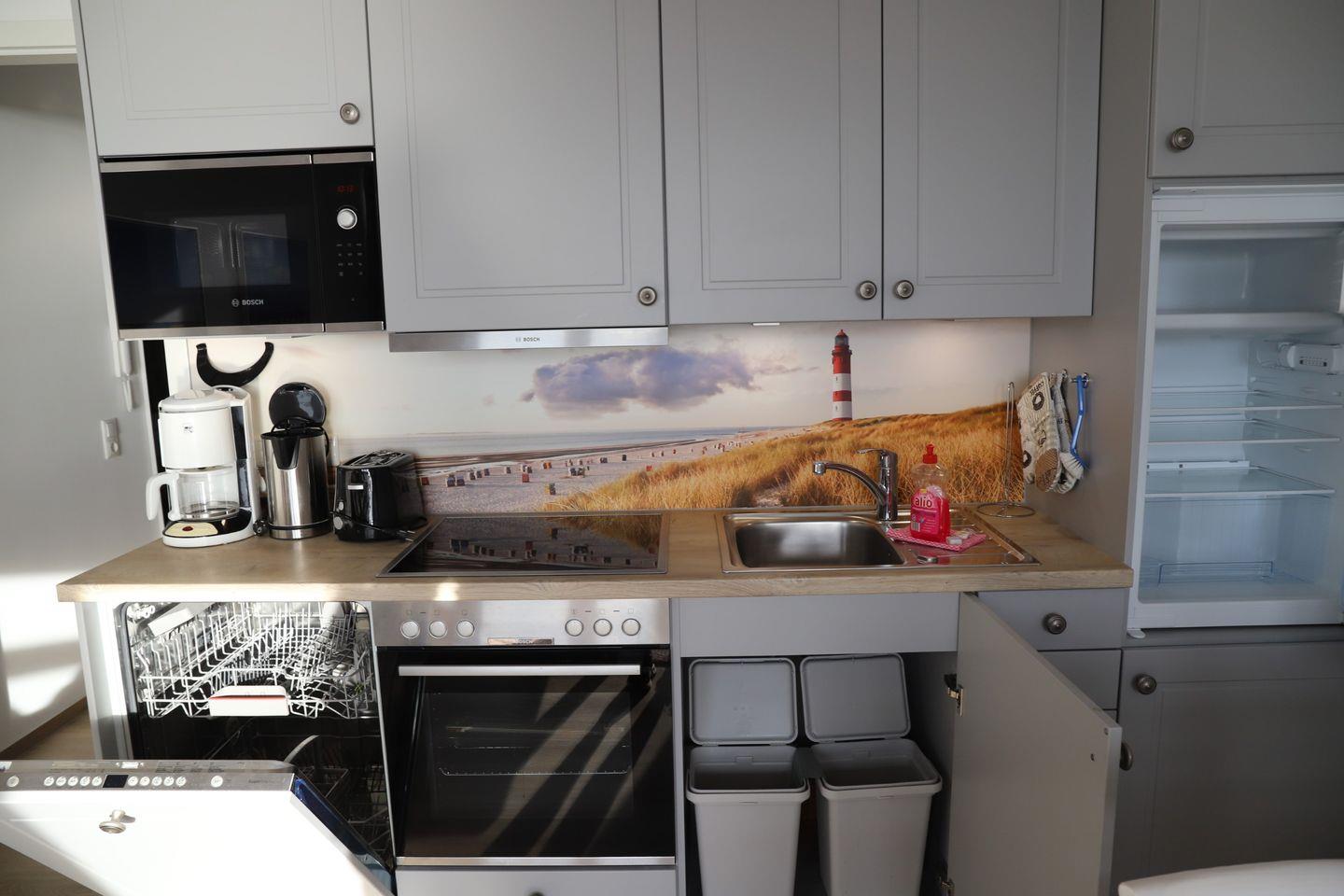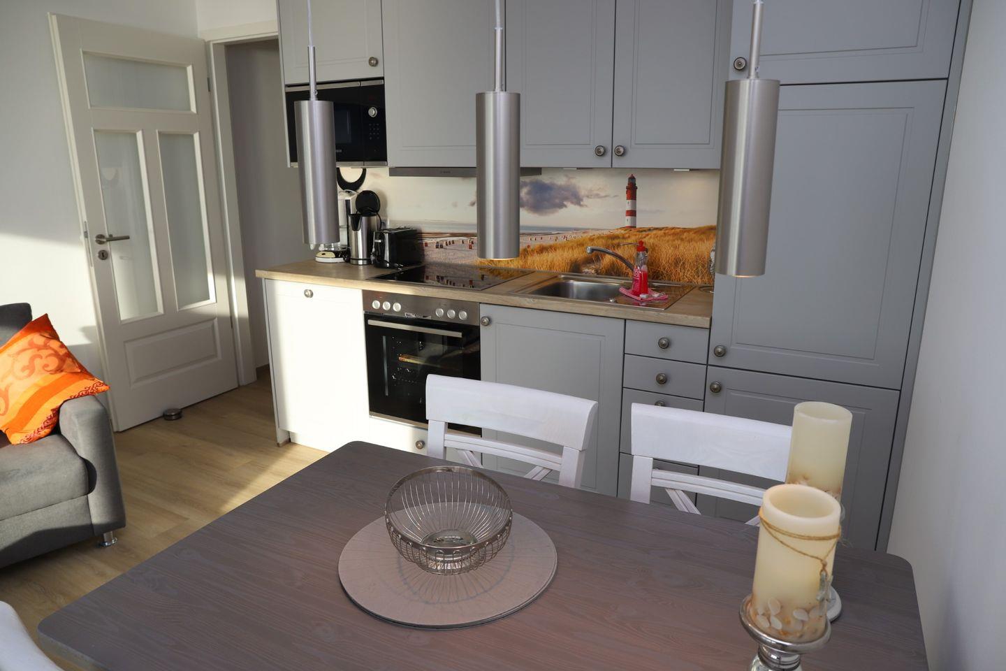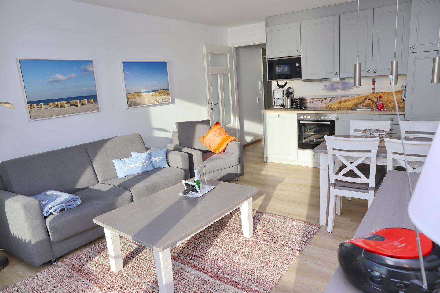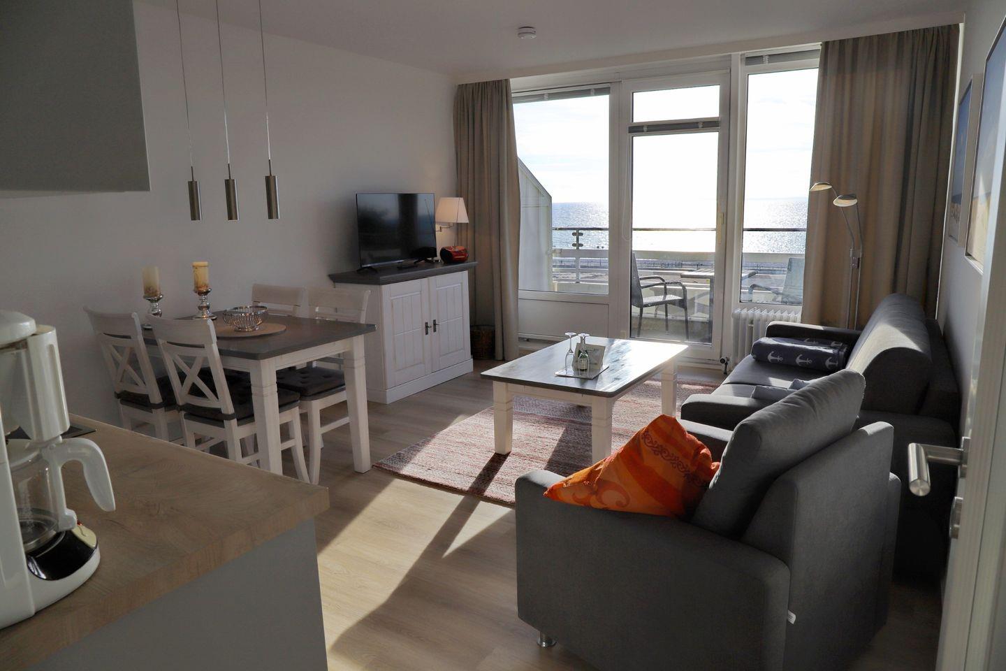 Schöne 2-Zimmer-Wohnung in der 5. Etage mit möbliertem Balkon in Südlage und traumhaftem Seeblick. Im Wohnzimmer gibt es eine Schlafcouch für 1 Person mit TV, Radio und einer Essecke mit 4 Stühlen. Die offene Küchenzeile ist mit einem Ceranfeld mit Backofen, einem Kühlschrank mit Gefrierfach, eine Spülmaschine, eine Kaffeemaschine, ein Wasserkocher und Toaster ausgestattet. Im Schlafzimmer befinden sich ein Doppelbett, zwei Nachttische und ein Kleiderschrank.