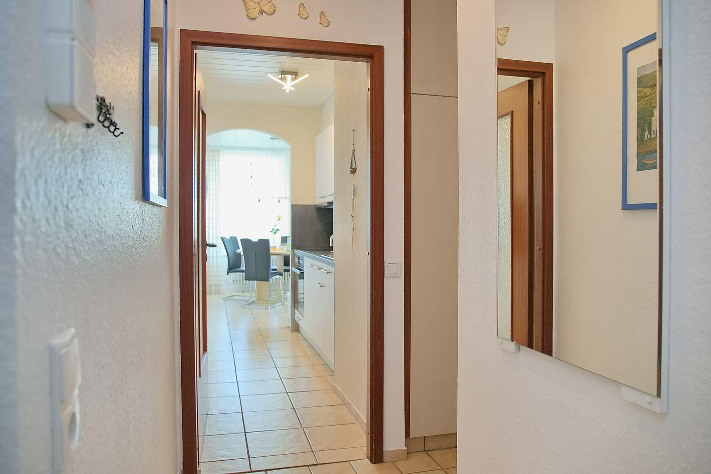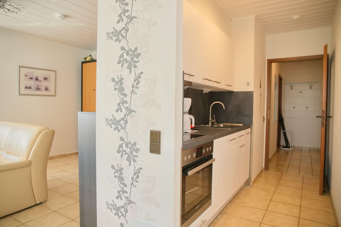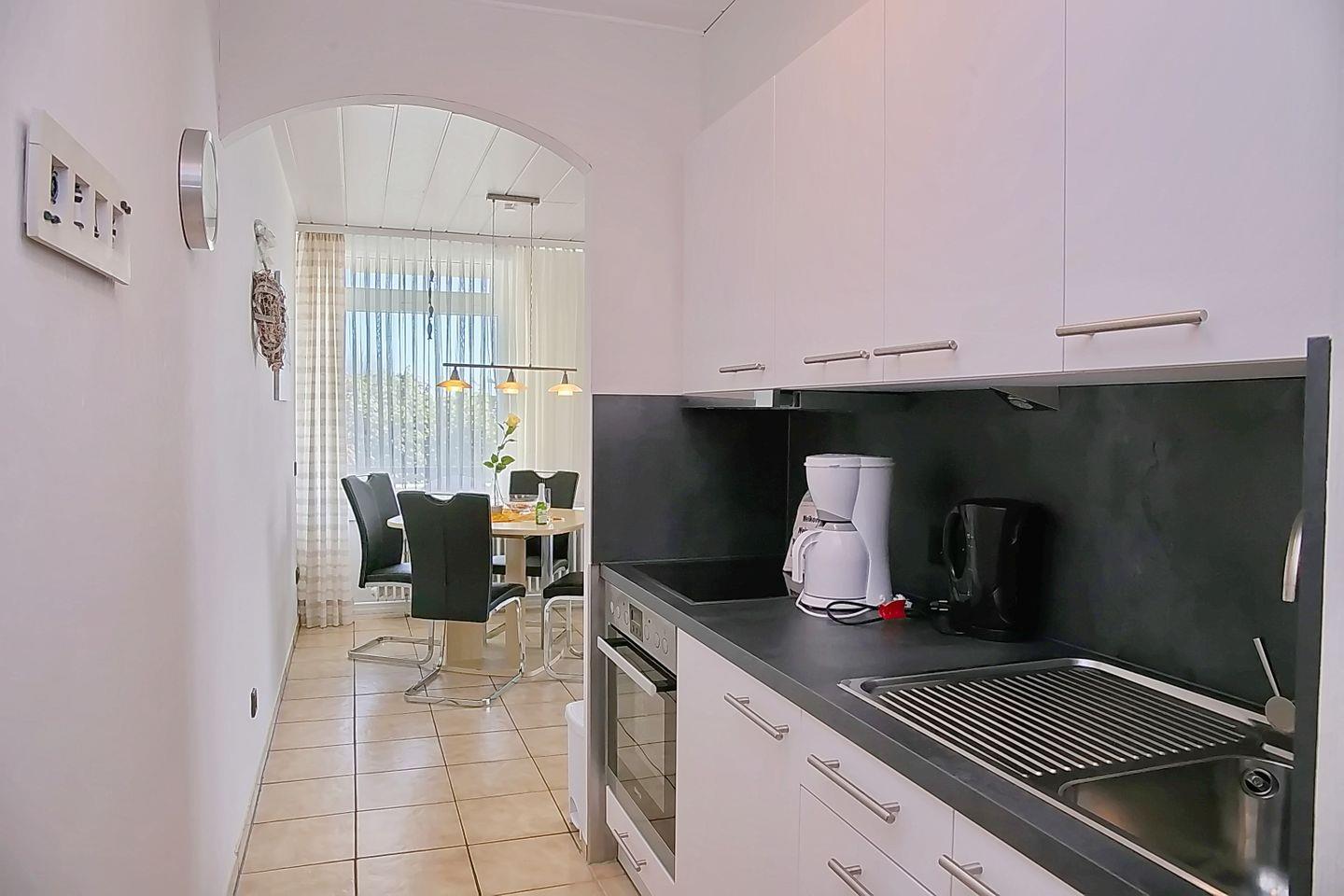 Durch die Diele mit einer tollen Garderobe und der Küchenzeile betreten Sie das Wohnzimmer mit einem gemütlichen Essbereich. Die Küche ist mit allem ausgestattet, was der moderne Urlauber braucht, um sich ein leckeres Mittagessen zu zaubern. Ein Herd mit Kochfeld und Backofen, eine Mikrowelle sowie Kaffeemaschine und Toaster für ein gelungenes Frühstück.