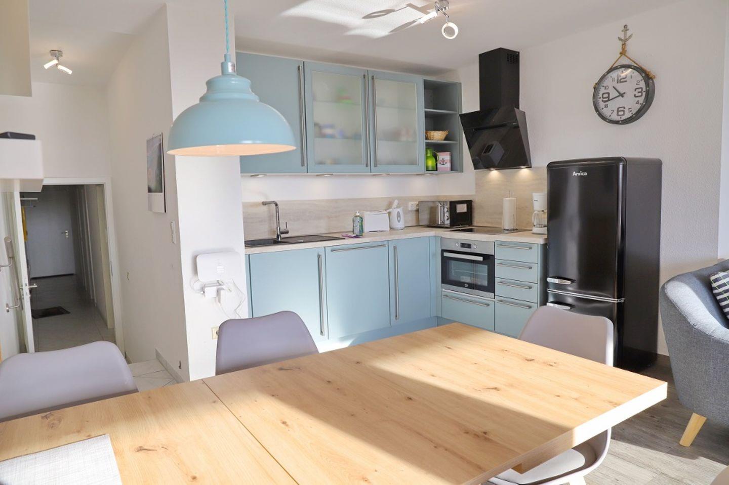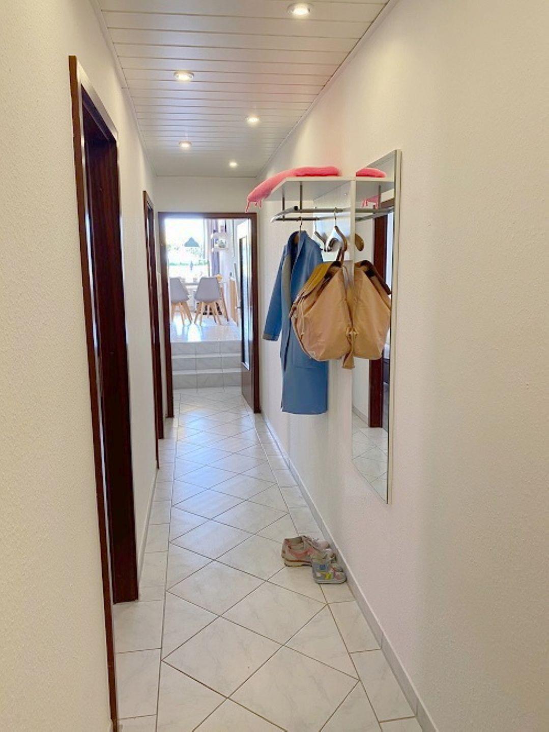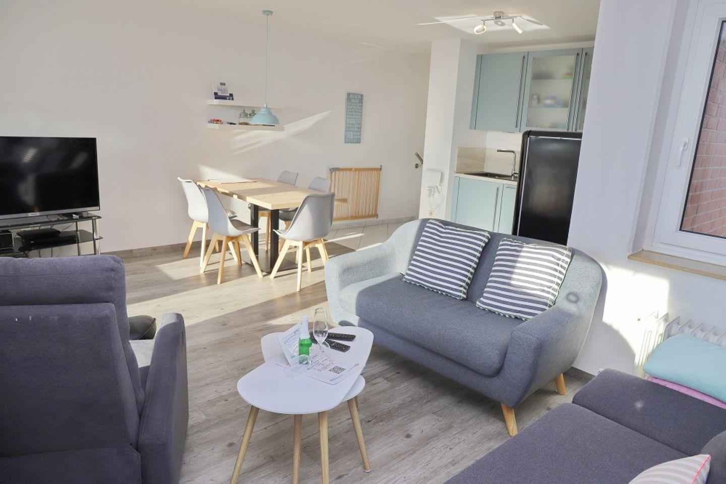Modernisierte Ferienwohnung in der 1. Etage mit möbliertem Süd-Balkon auf dem Sie in einem Strandkorb die Sonne in jedem Winkel genießen können. Im Wohnzimmer gibt es eine neue Schlafcouch in Grau, ein weiteres Sofa und einen Relax-Sessel, Magenta -TV mit Flatscreen, DVD, Internetradio und selbstverständlich kostenlosem W-LAN Zugang. Die Küche ist mit einem Herd mit Backofen , Kühlschrank mit Gefrierfach, Geschirrspüler, Mikrowelle, Kaffeemaschine, Wasserkocher, Toaster und einem Eierkocher ausgestattet. In der offenen Küche befindet sich ein Esstisch mit 5 Stühlen. Das Schlafzimmer wurde im Januar 2018 komplett erneuert. Es besteht aus einem modernen Boxspringbett mit Topper (180cm x 200cm), einem Kleiderschrank, einer Kommode und zwei Nachttischen. Das Kinderzimmer verfügt über ein Etagenbett (jeweils 90cm x 200cm), einem Kleiderschrank und einem kleinen Hocker. Dieses lässt sich mit einem Außenrolladen verdunkeln. Das helle Bad ist mit einem WC und Dusche ausgestattet. Rauchen ist nur auf dem Balkon erlaubt. Ein Hund ist herzlich willkommen.