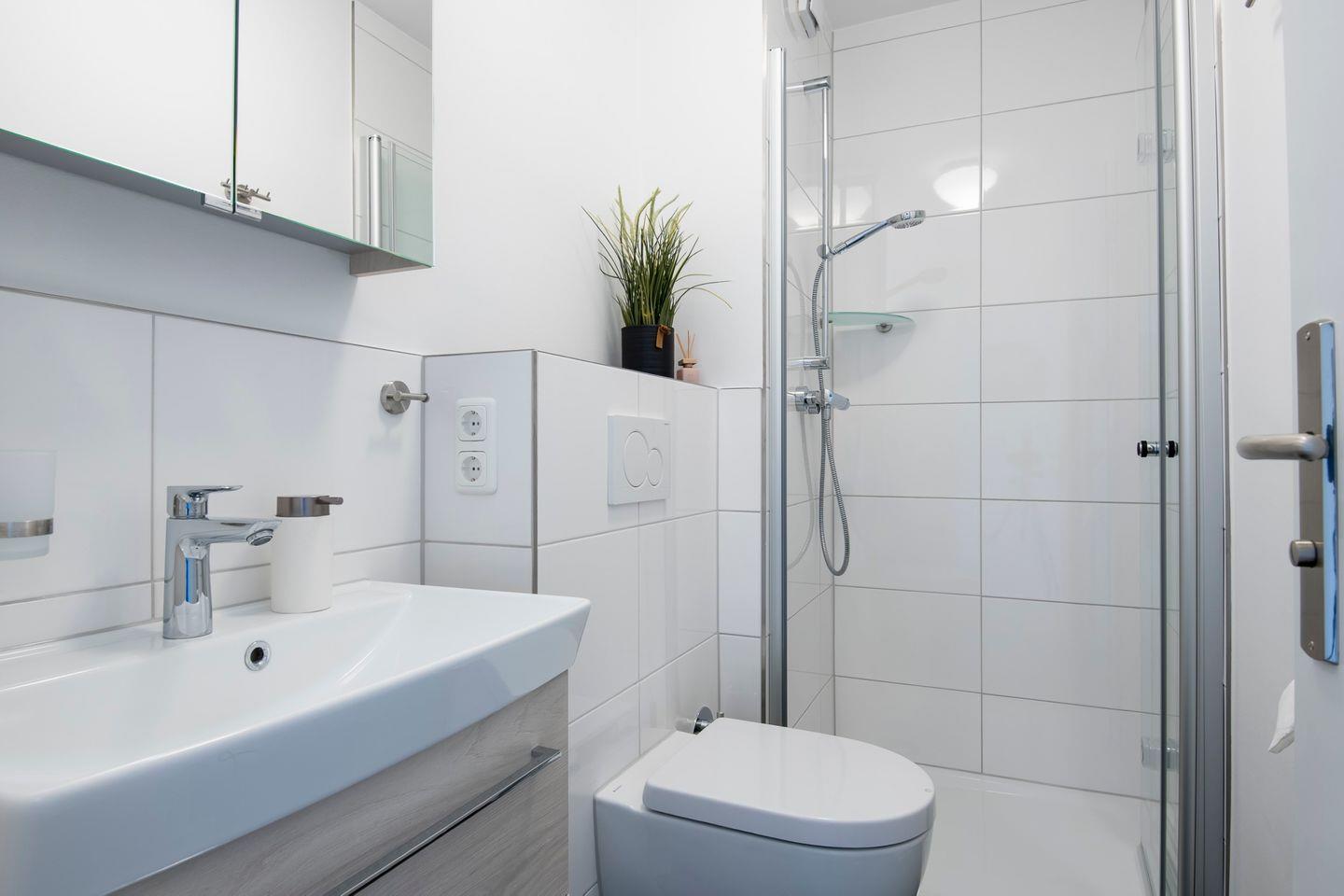 Die Wohnung verfügt über ein Badezimmer mit Dusche sowie über einen Südwestbalkon, der einen schönen Ausblick auf die Ostsee bietet und zum Entspannen einlädt.