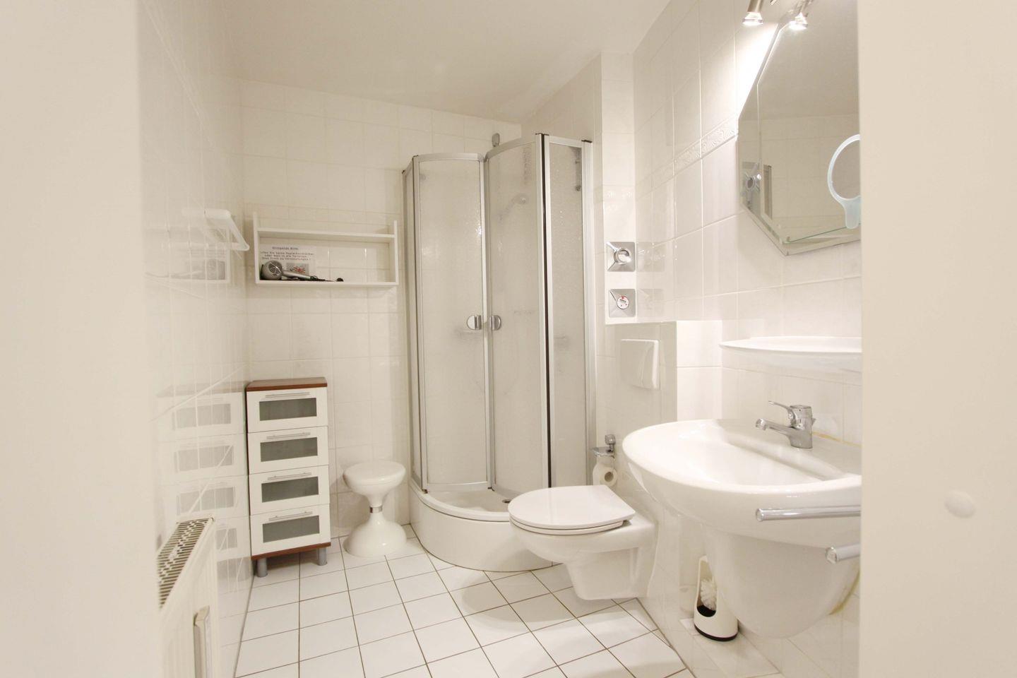 Das Duschbad mit WC, Waschbecken und beleuchteten Spiegel runden das Angebot ab.