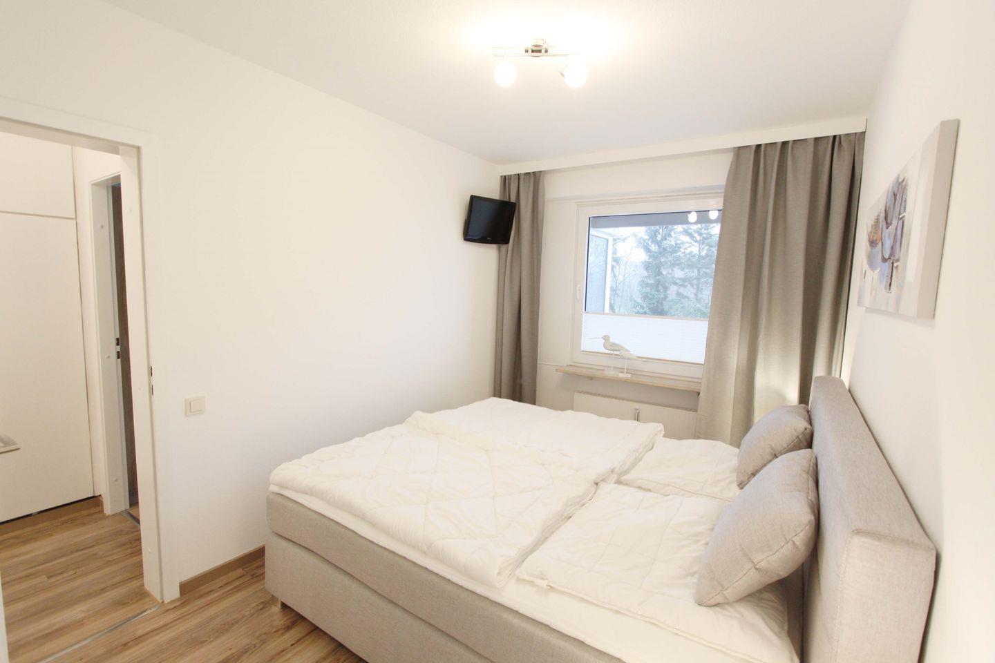 In dem separaten Schlafzimmer erwartet Sie ein gemütliches Doppelboxspringbett (180x200 cm, durchgehender Topper), ein großer Kleiderschrank und ein wandhängender Flach- TV.