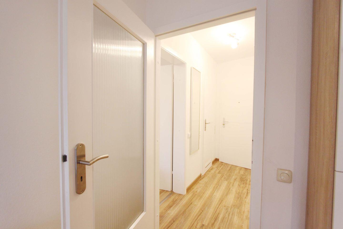 Dort angekommen, erwartet Sie eine helle und moderne Ferienwohnung. Über den Flur erreichen Sie alle Räume. Ein Einbauschrank hält viel Stauraum bereit.