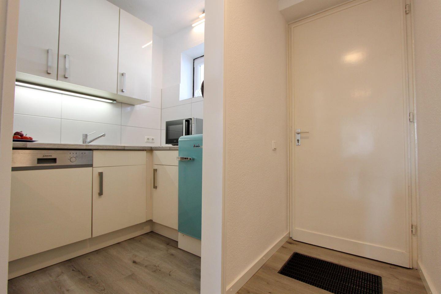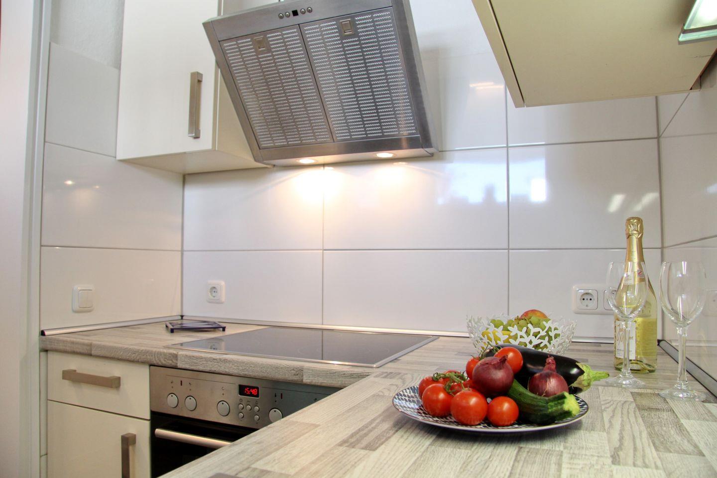 In der voll ausgestatteten Küche mit Fenster, finden Sie alles was Sie benötigen, um auch im Urlaub Ihre Lieben mit Köstlichkeiten zu verwöhnen. An dem modernen Cerankochfeld mit Backofen kann man nach einem Strandtag ebenso eine Kleinigkeit zubereiten wie auch ein Festmahl. Im Anschluss erleichtert die vorhandene Spülmaschine Ihren Urlaubsalltag. Eine Mikrowelle, Kaffeemaschine, Wasserkocher, Toaster, Mixer und ein schicker Retro Kühlschrank mit 3* Gefrierfach runden das Interieur der Küche ab.