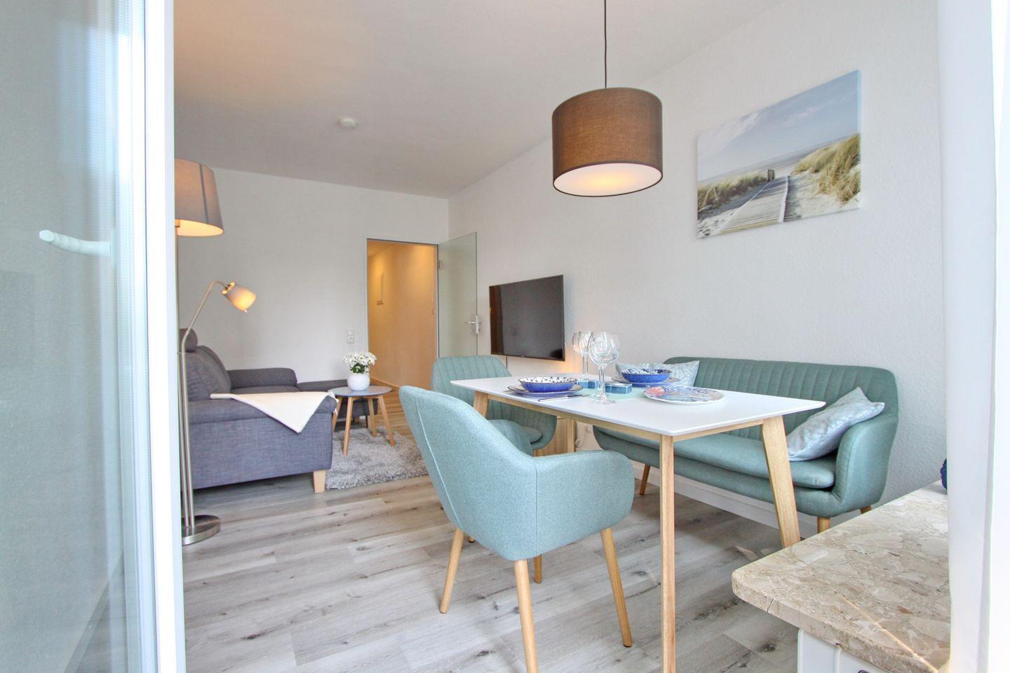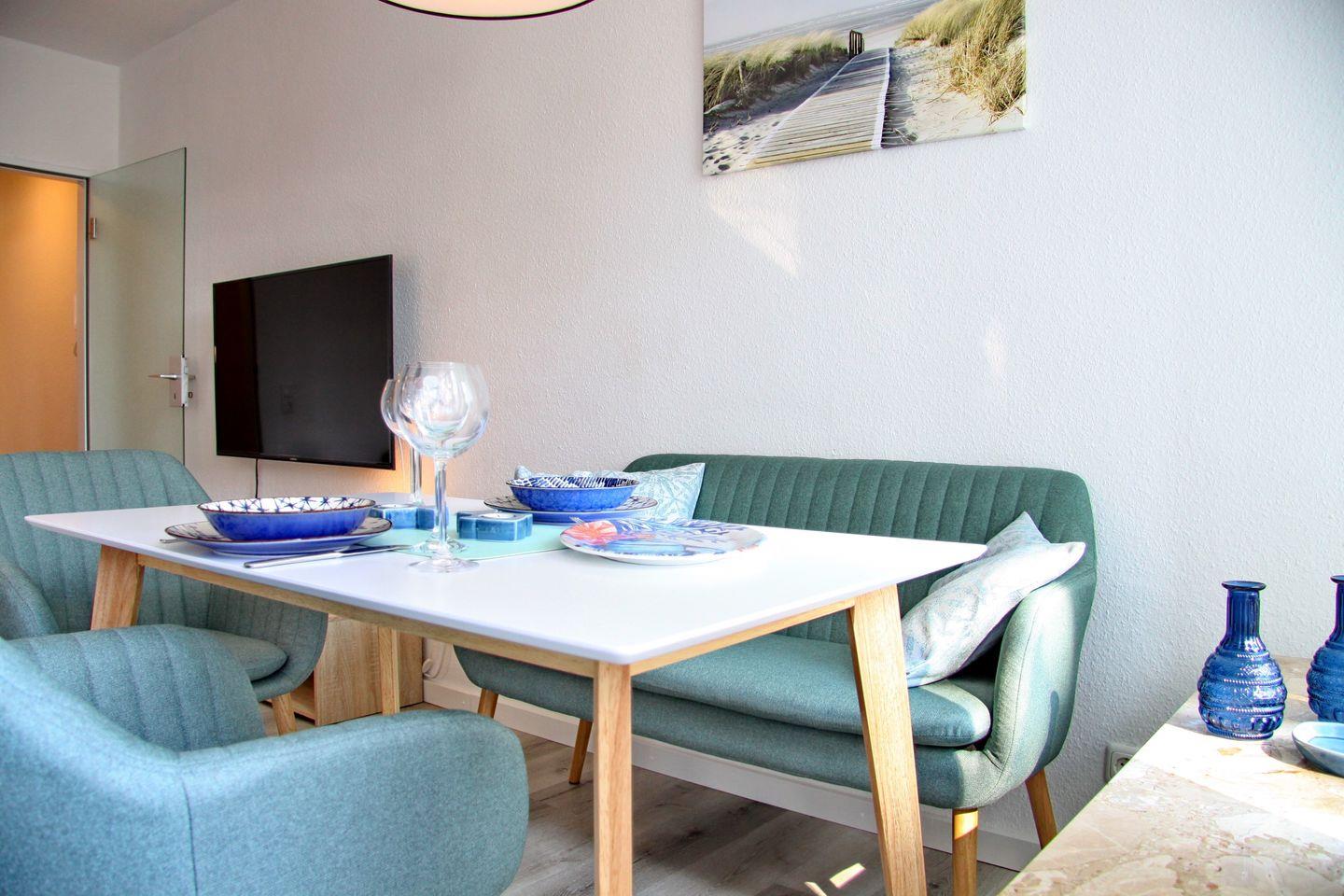 Vom großen einladenden Flur gelangen Sie ins lichtdurchflutete Wohnzimmer. Dort erwartet Sie ein großer Flach-TV mit Internetfunktion, ein komfortables Sofa mit Fußbank, ein Couchtisch, einen gemütlichen modernen Essbereich mit Sofabank und 2 Stühlen, an denen Sie gemütliche Abende verbringen können. Vom Wohnzimmer aus erreichen Sie den großzügigen möblierten Balkon in Süd/West Lage, auf dem Sie bei einem Glas Wein die Abendsonne genießen können. Falls notwendig, sorgt eine Markise für die notwendige Beschattung.