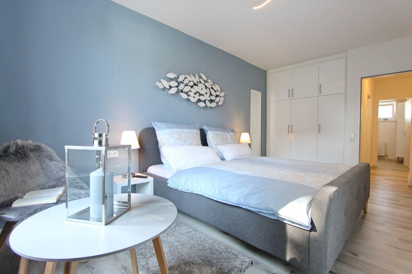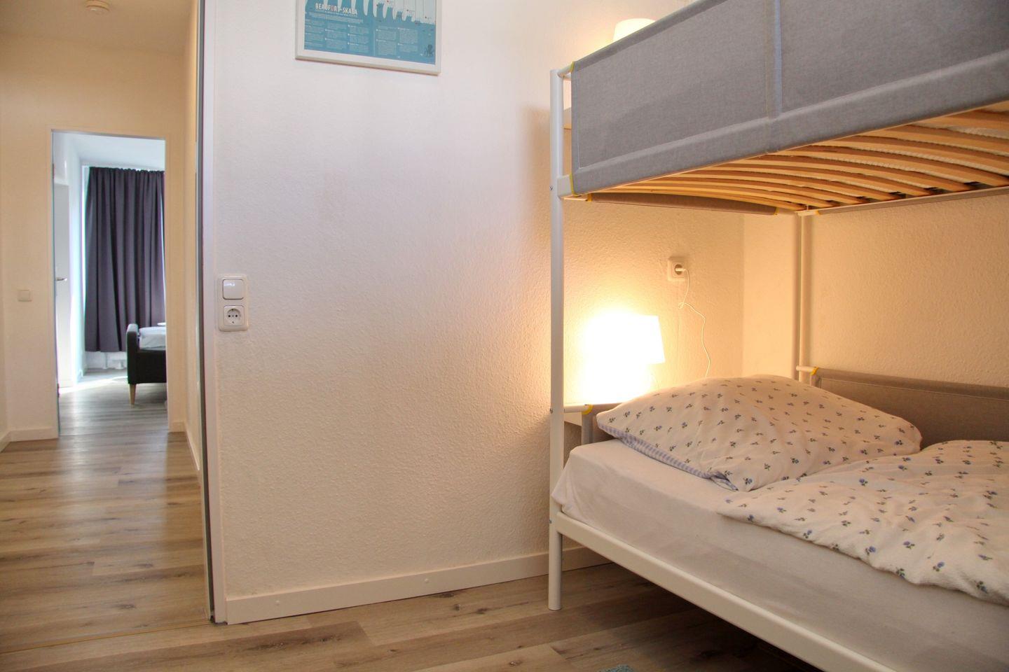 Vom Flur aus erreichen Sie ebenfalls die zwei Schlafräume. Das erste größere Schlafzimmer verfügt über ein komfortables Polster-Doppelbett (2x90x200 cm), einen großen Einbau- Kleiderschrank und einen Wandspiegel sowie eine gemütliche Leseecke mit Sitzgelegenheit. Das zweite Schlafzimmer bietet ein Etagenbett (2x90x200 cm) und einen Kleiderschrank. Beide Schlafzimmer verfügen über sehr gute Verdunkelungsmöglichkeiten.