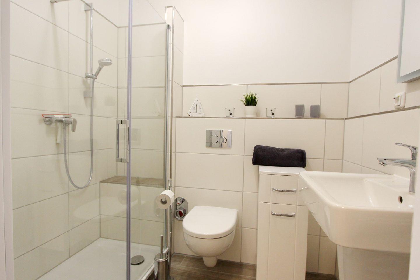 Das moderne Duschbad verfügt über einen großen beleuchtetem LED- Spiegel, einen Handtuchheizkörper, eine Dusche und einen Schrank, in dem Sie ausreichend Stauraum für Ihre Hygieneartikel finden.