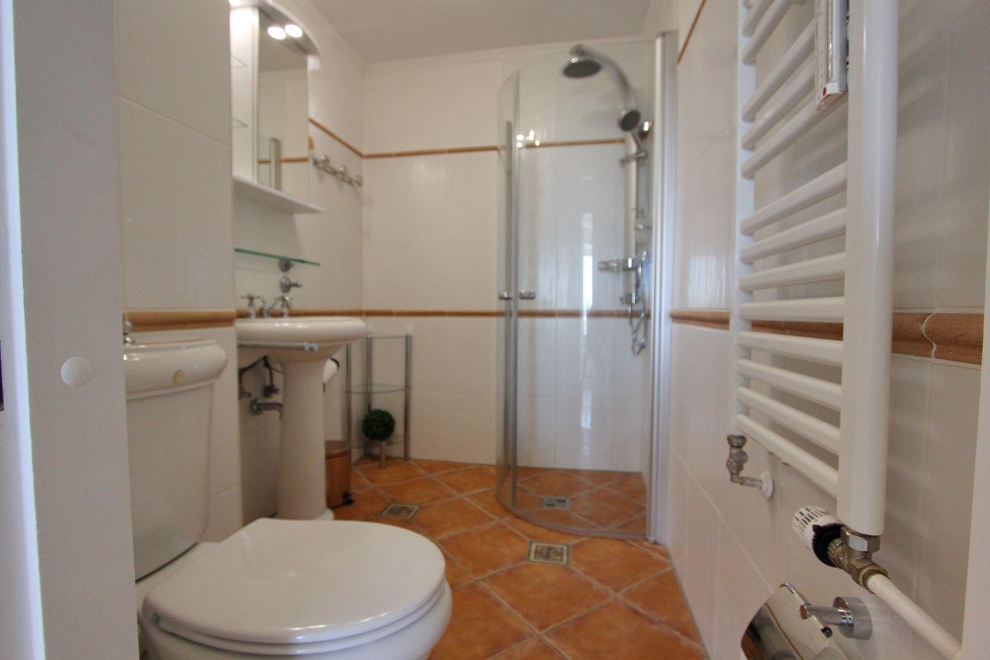 Das Duschbad (Achtung, hier ist eine Stufe) mit WC, Waschbecken und Spiegelschrank komplettiert die Wohnung.