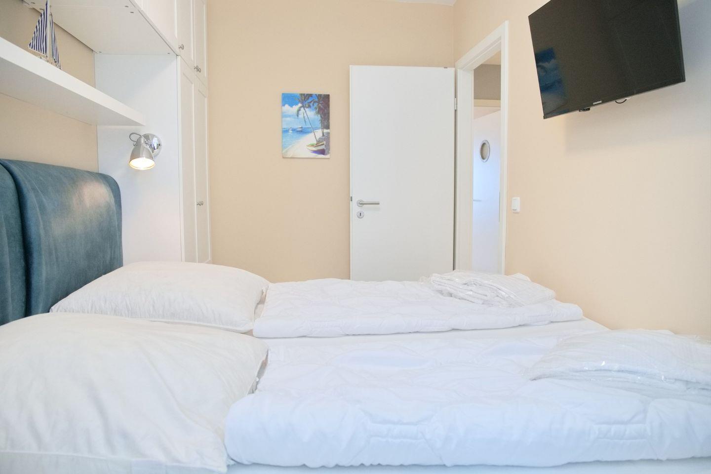 Das Schlafzimmer beeindruckt mit einem luxuriösen Boxspringbett (elektrisch verstellbar, Topper, 180x200 cm) und einrahmende geräumige Kleiderschränke, um Ihre Urlaubsgarderobe ordentlich zu verstauen sowie einem weiteren Smart-TV. Das Kinderzimmer bietet Platz für die Kleinen mit einem Kojenbett (90x200 cm), das zu einem Doppelbett umfunktioniert werden kann, sowie einem weiteren Kleiderschrank.
