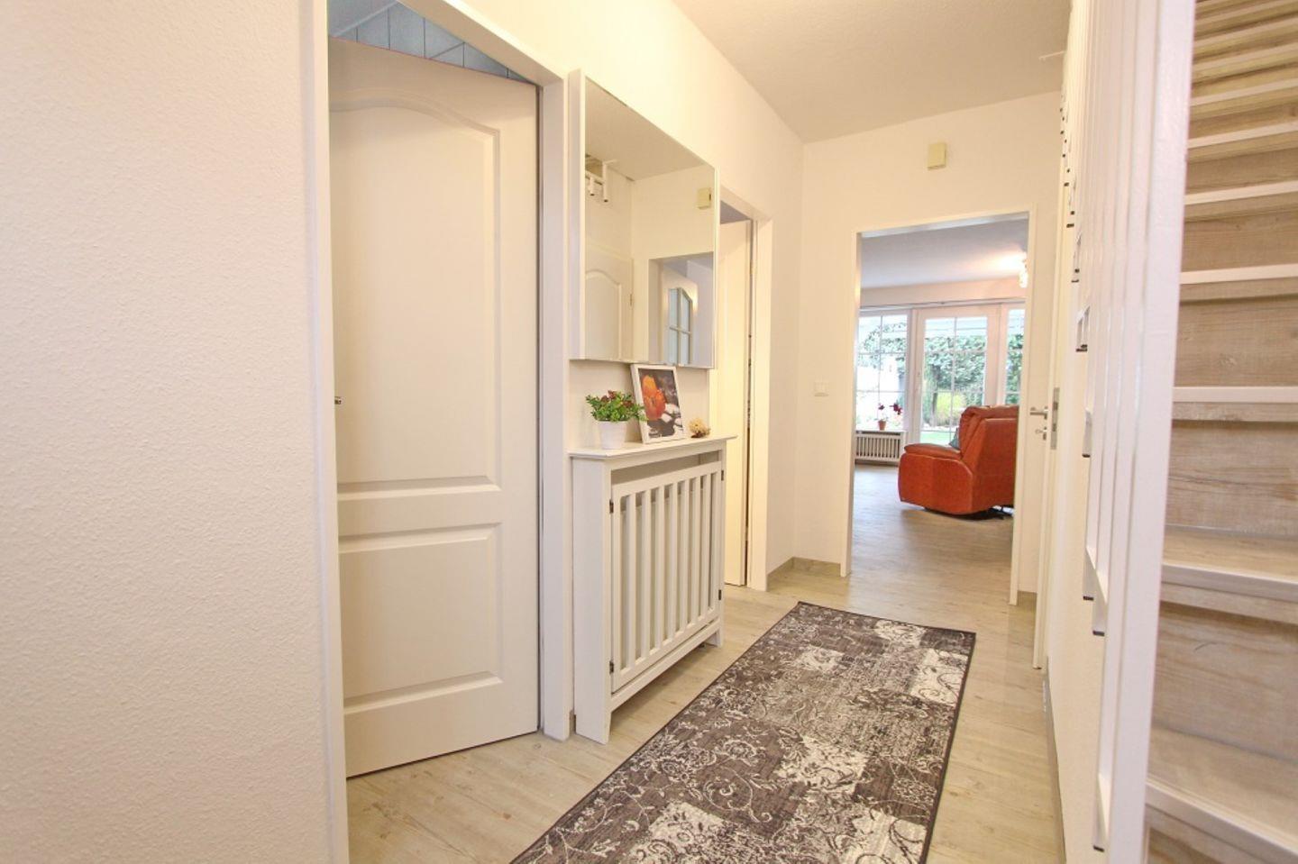 Im Haus empfängt Sie ein freundlicher Flur mit Spiegel und Garderobe.